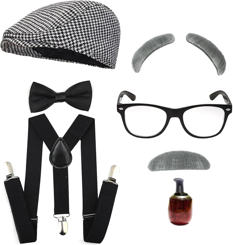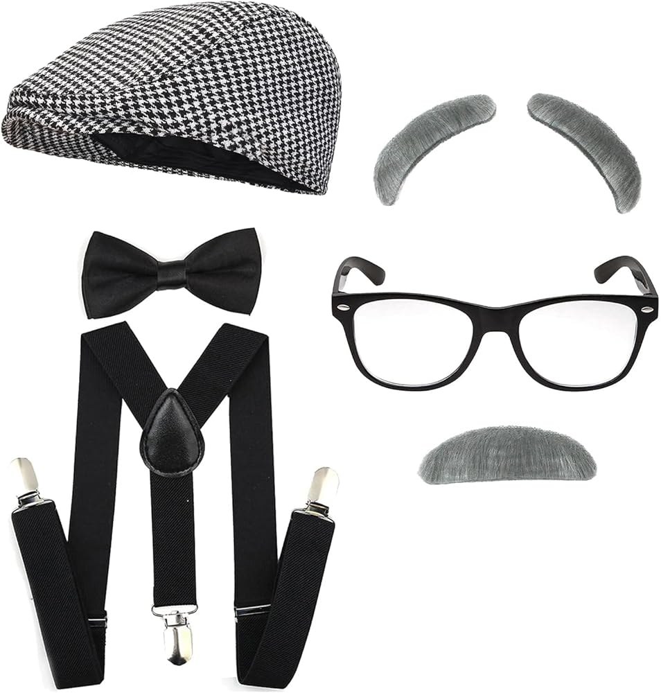 Packet Include: 1 X Old Man Hat 1 X Adjustable Suspenders with Pre-tied Bow Tie 1 X Old Man Eyebrows & Moustache 1 X Nerd Fake Glasses