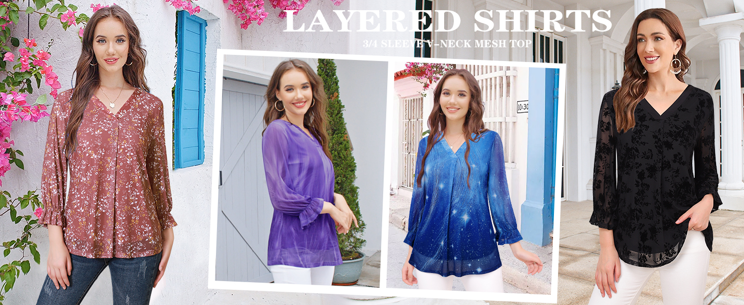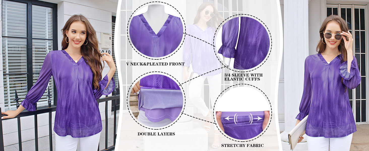 FEATURES: Ruffle 3/4 Sleeve Top with Elastic Cuffs, V Neck, Pleats Front,Floral Printed,Double Layers, Loose Fit,Trendy and Elegant Flowy Mesh Tunic Blouses for Women. The length of the garment covers the hips.