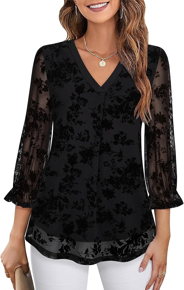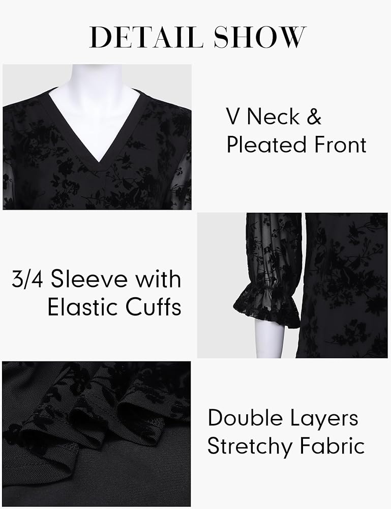 TRENDY 3/4 SLEEVE DESIGN: Semi-sheer ruffle 3/4 sleeve gently shows your elegance by covering your arms. The elastic cuffs provide great convenience in wearing, allowing you to stay comfortable all day long, stylish and casual.