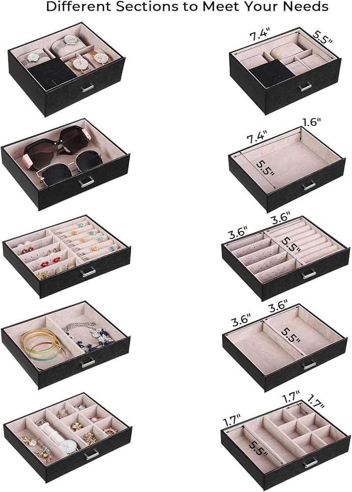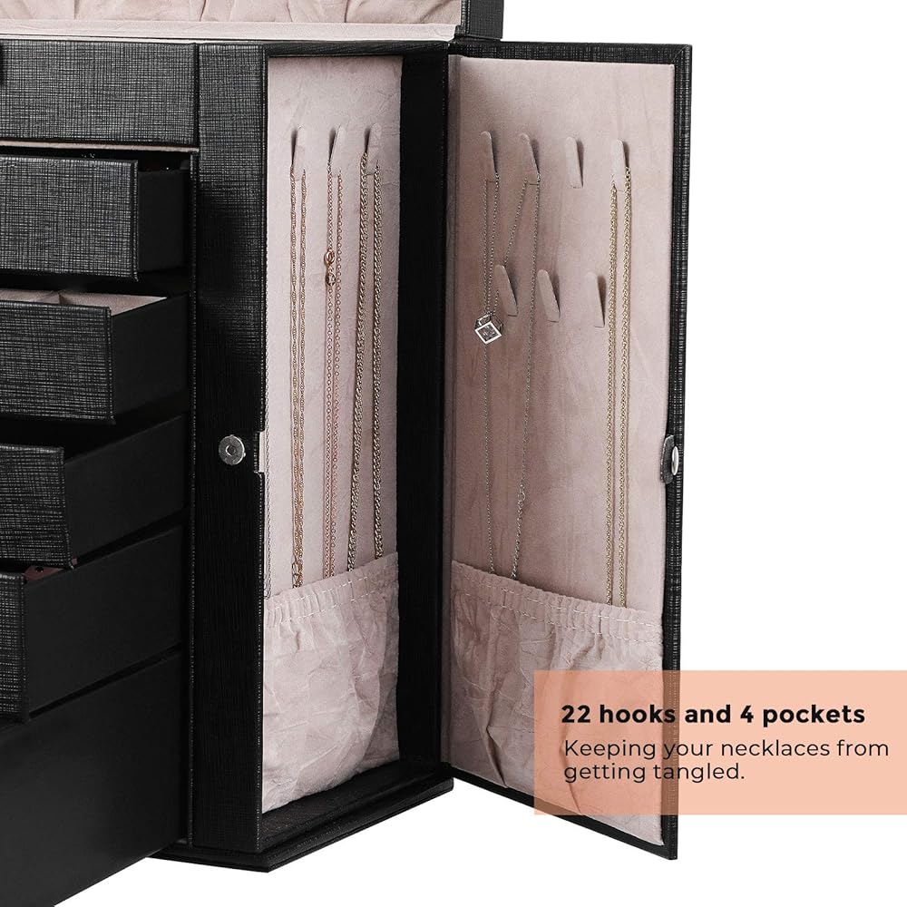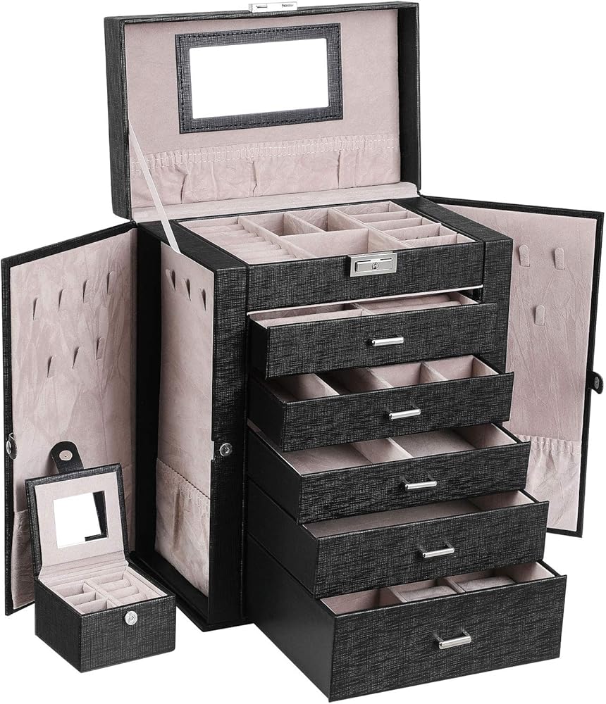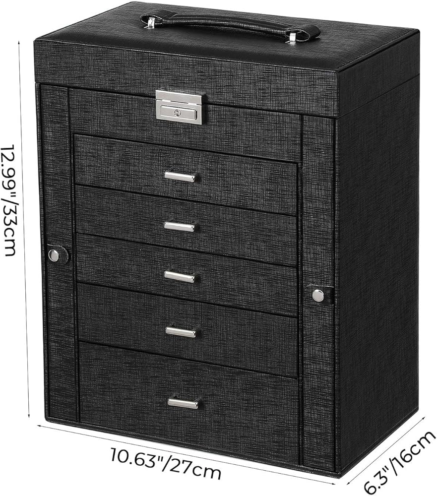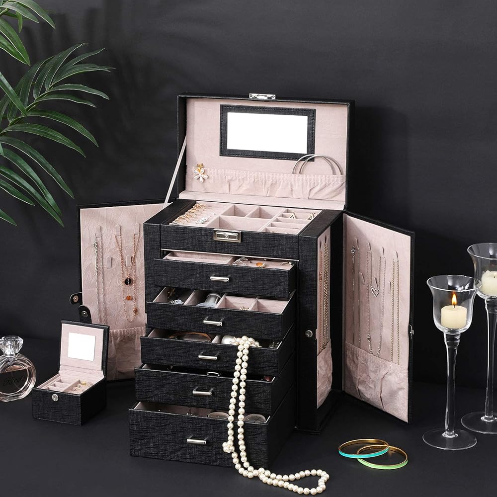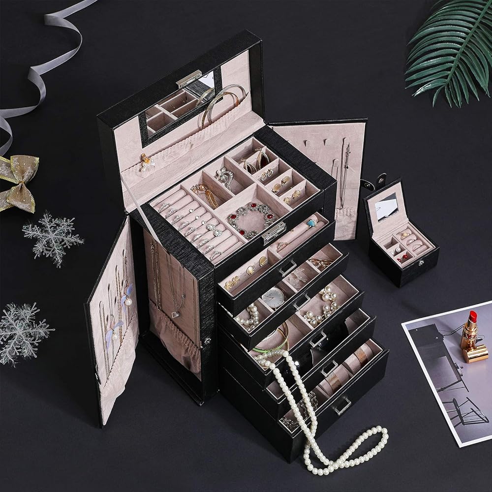 【BULIT-IN MIRROR & MULTI-FUNCTIONAL COMPARTMENTS】Built-in glass mirror provide perfect view when you try your jewelry on. Top lid section has a lower elastic pocket to keep necklace, bracelets perfectly in place. The 1st Tier and 5 pull out drawers contains slots with different size for your necklaces, bracelets, watches hair clips, earrings, rings, chains, cufflinks etc orderly. What's more, 1 deeper drawer of this jewelry is specially designed for sunglasses or large jewelries.