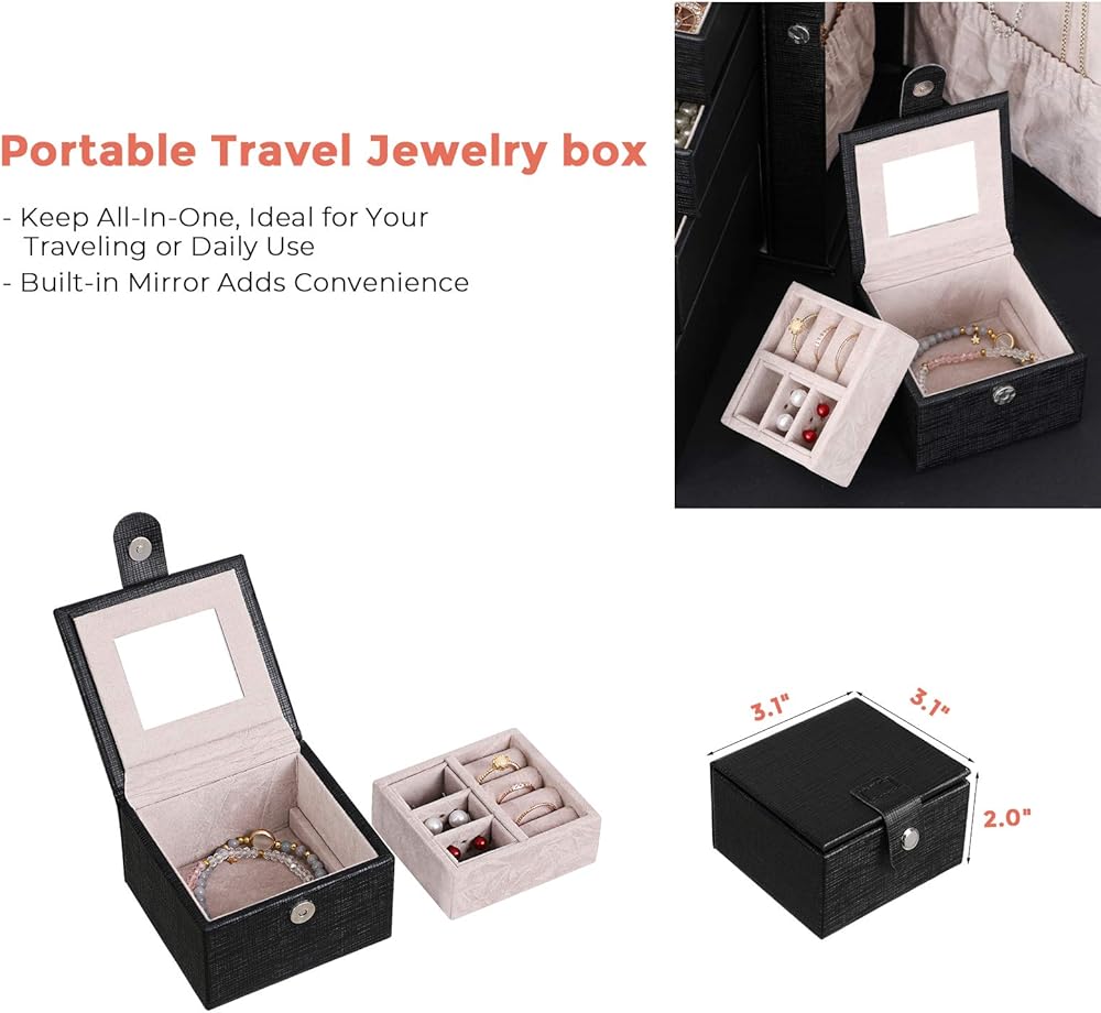 【SPACE SAVING & PORTABLE TRAVEL CASE】Dimension: 27 x 16 x 33cm (L x W x H) when closed. This jewelry case keeps your daily jewelry organized and it is space saving on your dressing table. There is a removable mini travel jewelry organizer in the bottom drawer, which keeps your daily jewelry organized and it is portable to be placed in your handbag or luggage.