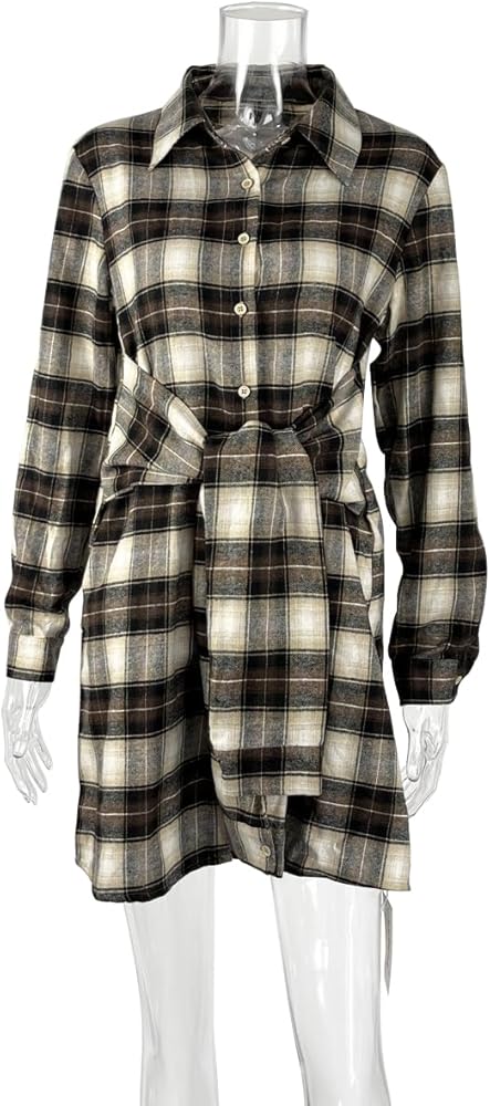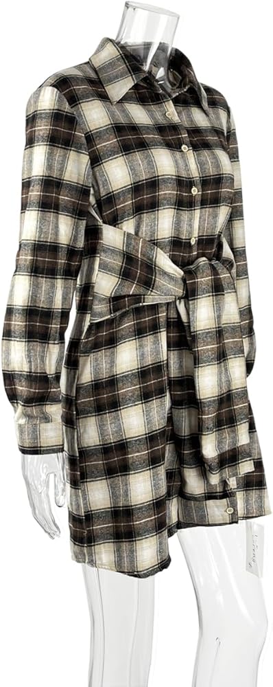 Features:Long Sleeve,Lapel V Neck,Casual Mini Shirt Dress,Plaid Tunic Shirt Dress,Tie Around Waist,Tie Front,Button Down Shirt Dress,Slim Fit,Patchwork Color,Unique Wrap Front.