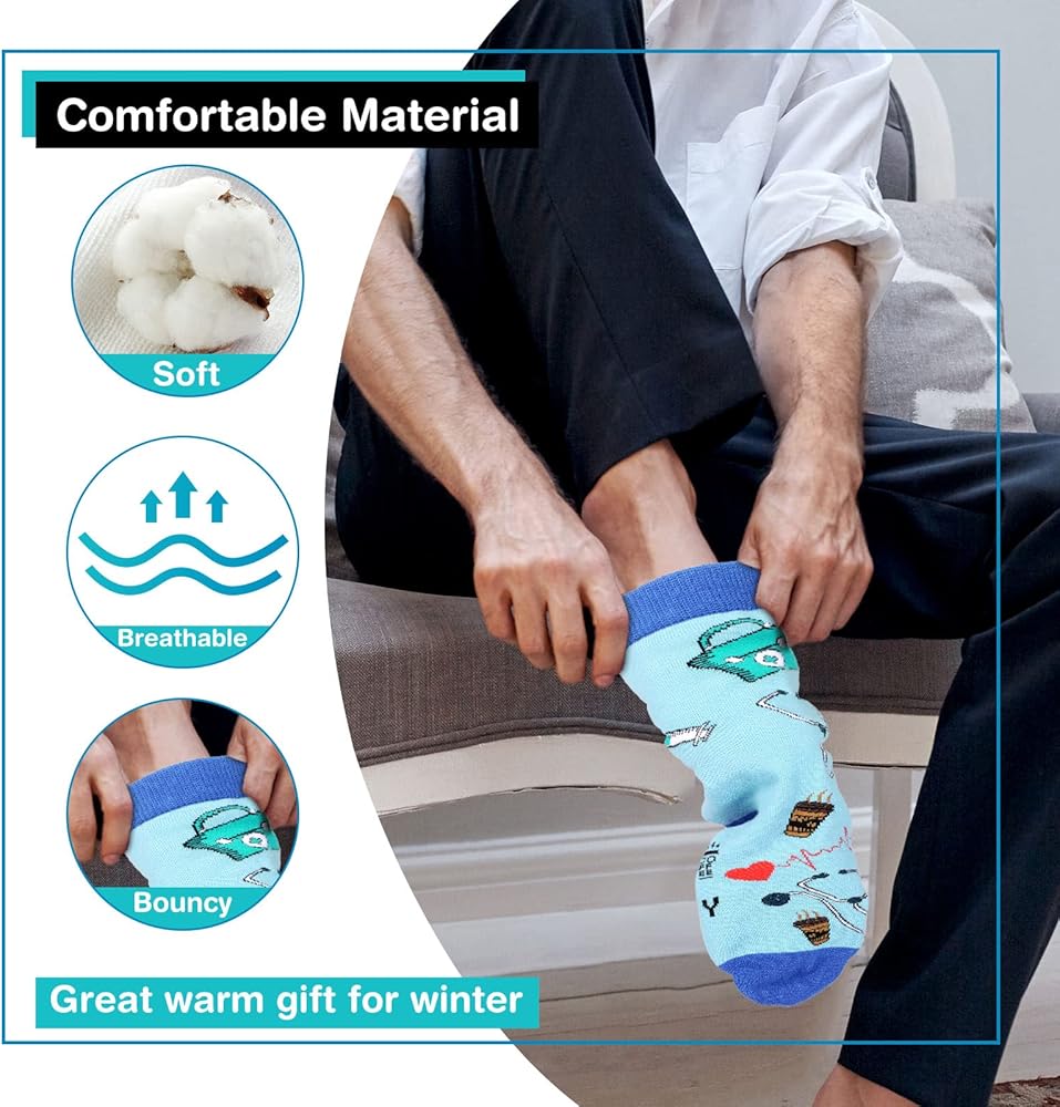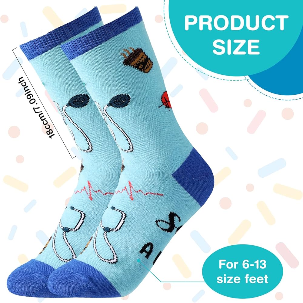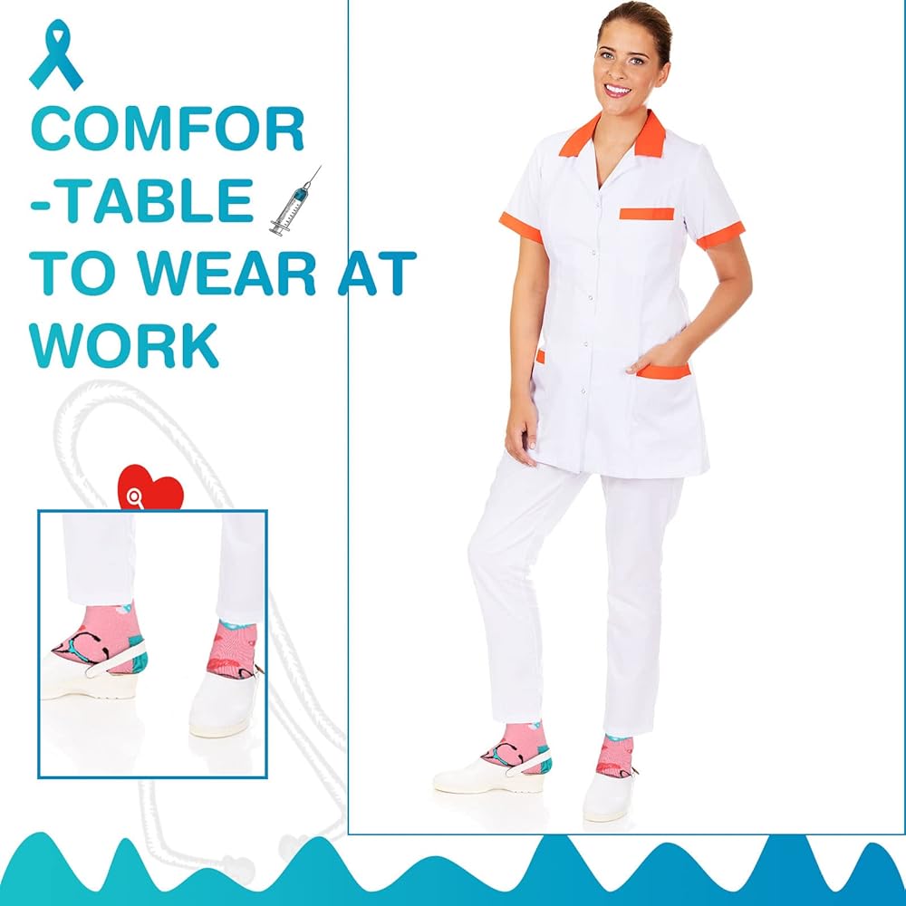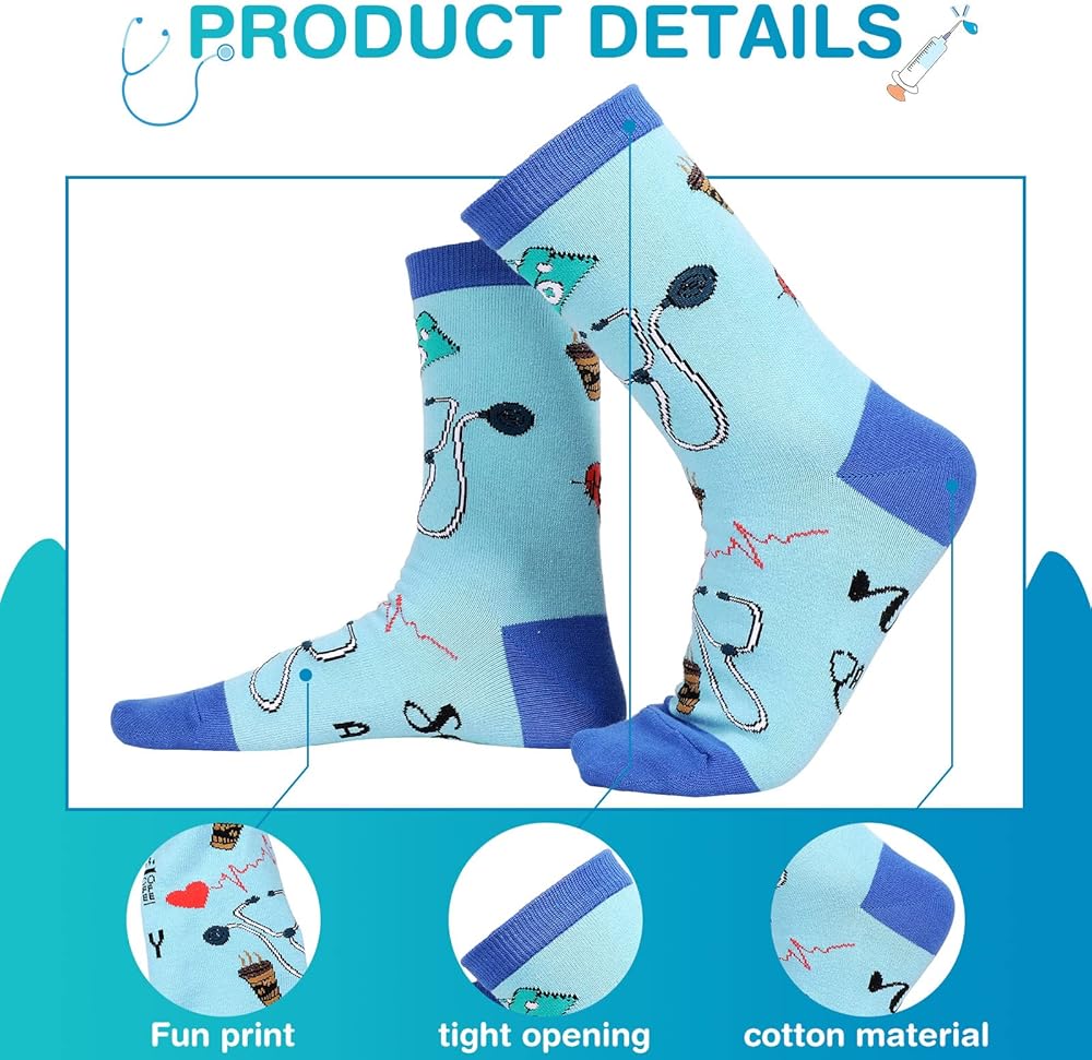 تصميم ذو طابع طبي: زوج من جوارب الكاحل للطبيب مصمم للممرضات والأطباء وغيرهم من الأشخاص الذين يعملون في المجال الطبي، مع مجموعة كاملة من العناصر الطبية، مثل سماعة الطبيب ورسم القلب والأقراص والصندوق الطبي؛ يمكن للأنماط الكلاسيكية والحيوية أن تؤكد على العمل الشاق وتفاني الممرضات، وإعطاء هذه الجوارب القطنية للممرضات خارج الخدمة، وسيقدرون الهدية المدروسة التي يمكنهم القيام بها فعلا استخدام كل يوم كل يوم