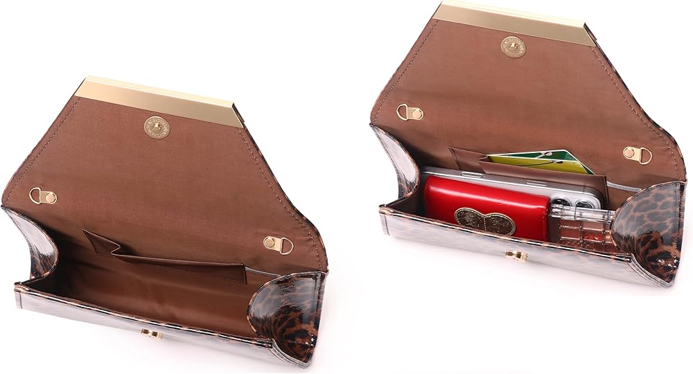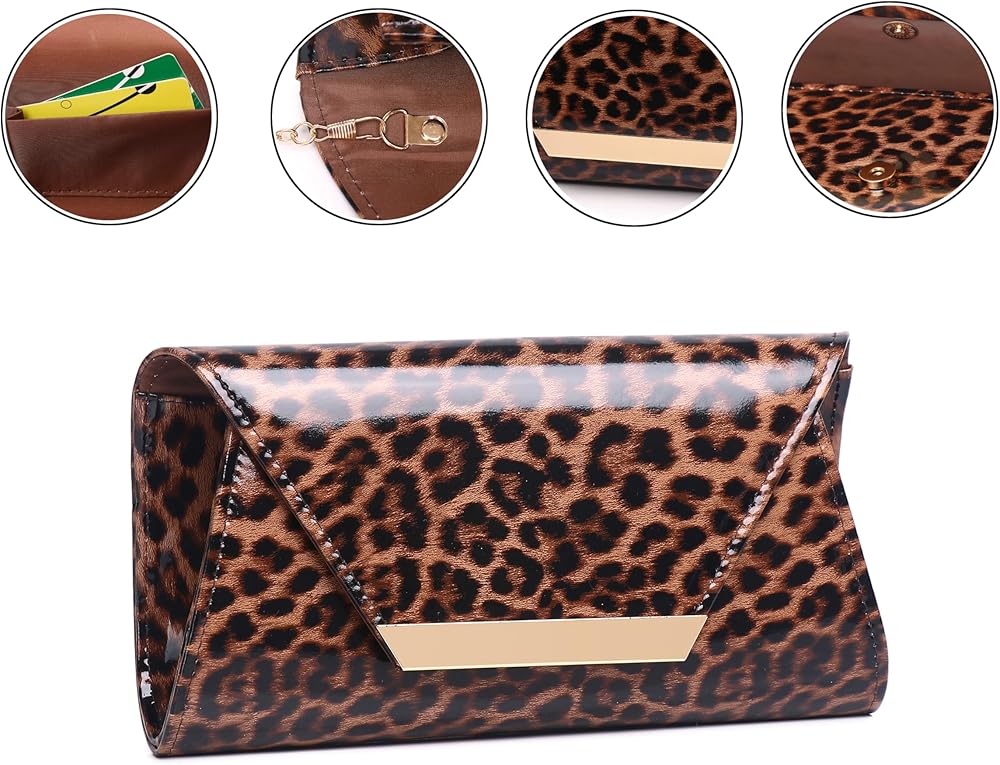 Material --- This envelope clutch is made of faux patent leather, which is easy to match your evening dress, shoes and nail polish. Inside color matching fabric lining with slide pocket.
