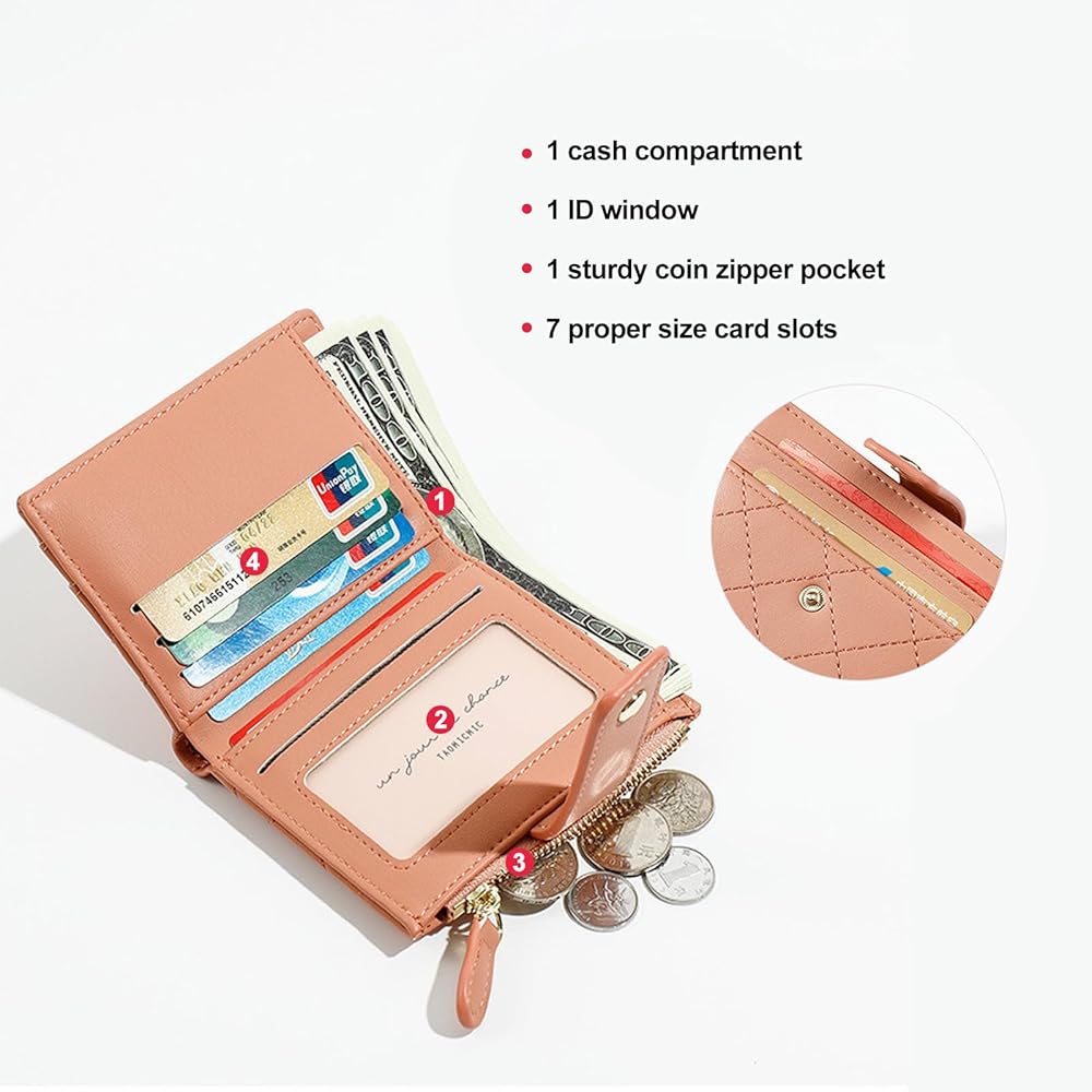 Storage capacity: The ladies wallet has a total of 7 proper size card slots, 1 ID window, 1 cash compartment, 1 sturdy coin zipper pocket. With 2 card slots on the outside, you can keep your frequently used cards on the outside, no need to open the wallet completely every time, good privacy protection