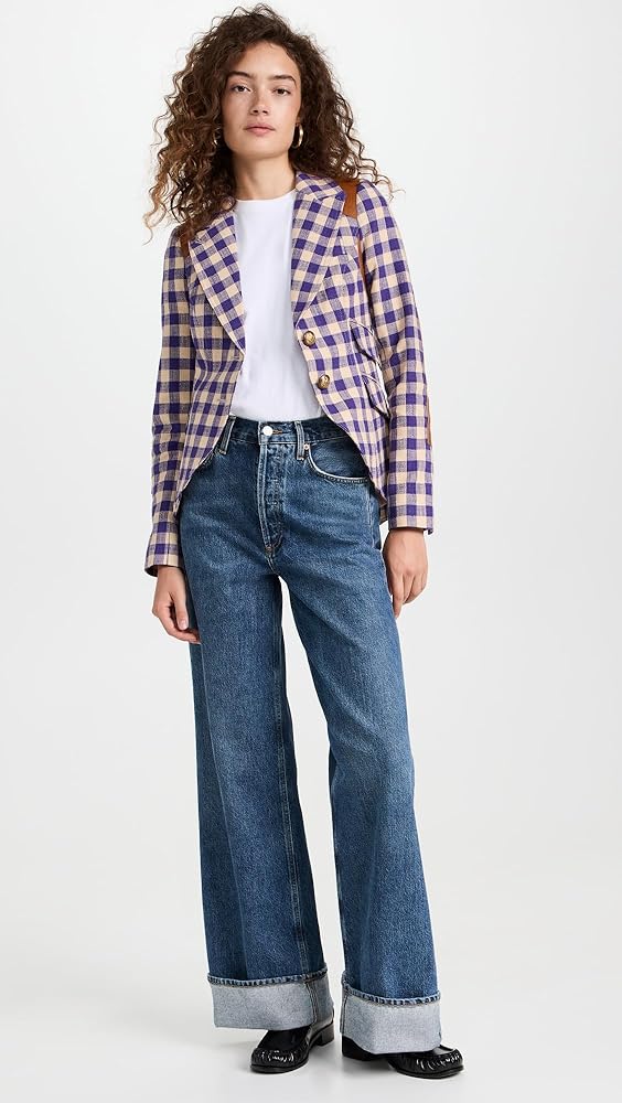 Check pattern , Leather trim throughout , Notched lapels and single-button closures, 1 welt breast pocket and patch hip pockets, Long sleeves with padded shoulders and 4-button cuffs, High low hem , Single back vent