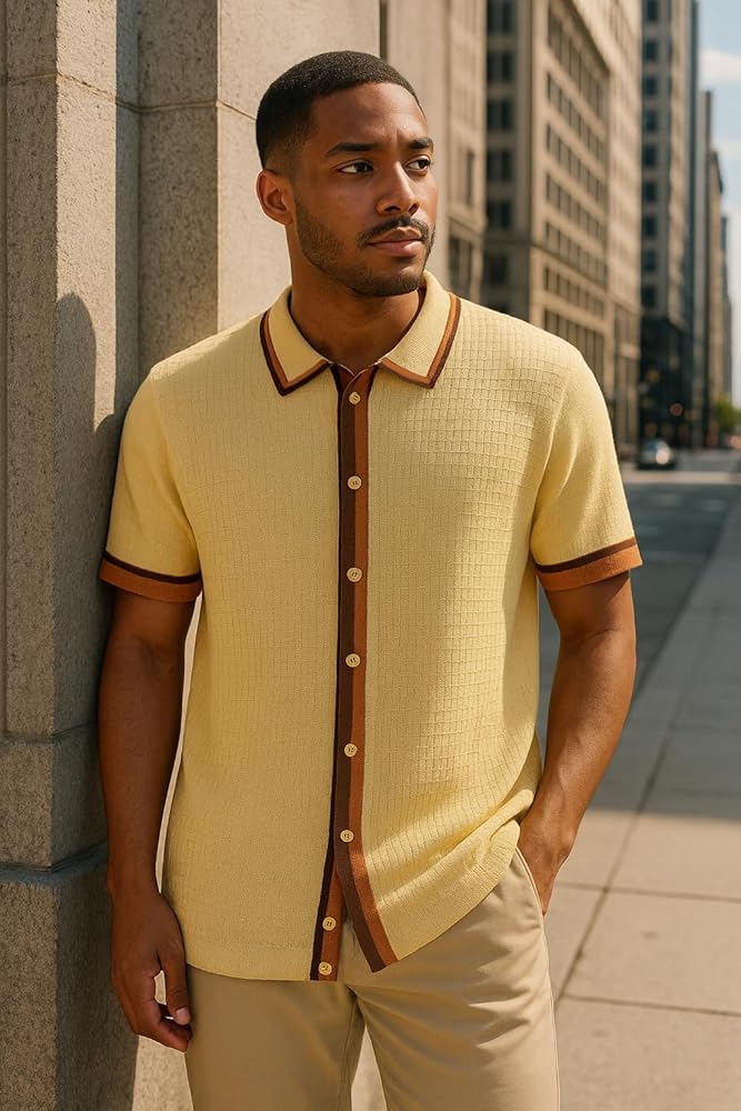 Fully Knitted Buttoned Shirt with side vents. Made to wear outside the pants 100% structured breathable soft acrylic for warm and cool weather fashion.