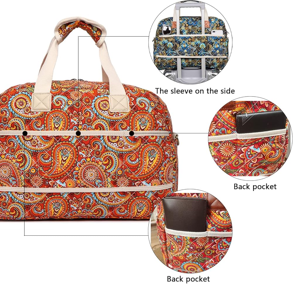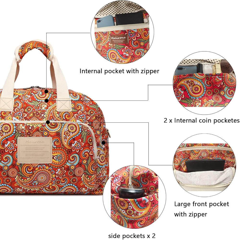 Material:Colourfast canvas with stainless steel hardware,cotton lining.This overnight bag featured with original floral pattern shows your young girl heart