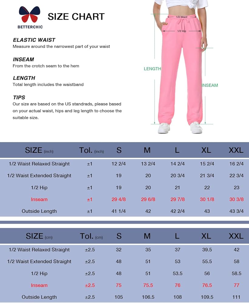 ✅ [Size guide]: Our size are based on the US standrads. Before order, please carefully read the BETTERCHIC Size Chart we provided in the last picture and based on your actual waist, hips and leg length to choose the most comfortable size. The outside length includes the waistband, S (Length)-41 1/4 inch, M (Length)-42 inch, L (Length)-42 2/4 inch, XL (Length)-43 inch, 2XL (Length)-43 3/4 inch.