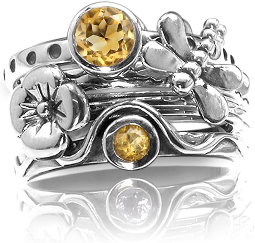 Silvershake Set of 4 Gemstone 925 Sterling Silver Dragonfly and Flower Stackable Rings Jewelry for Women Multiple way of Wear
