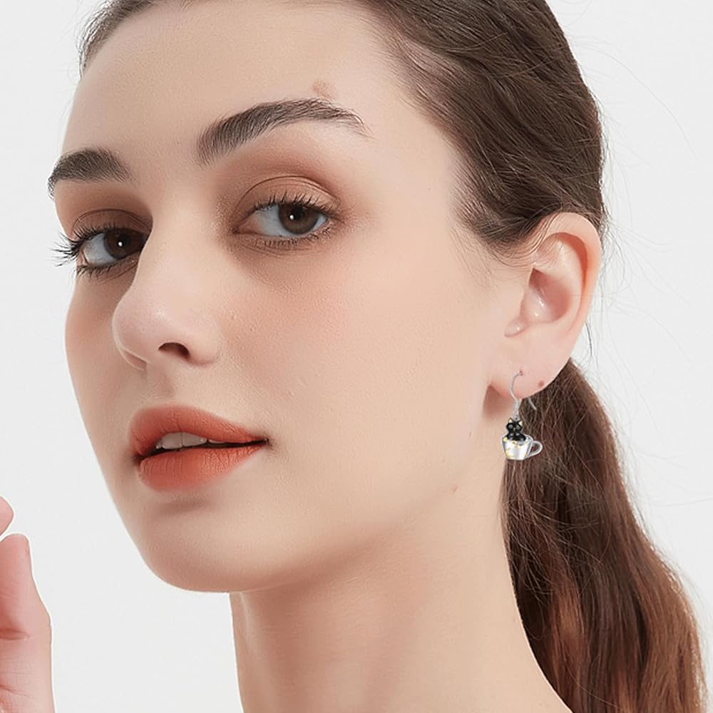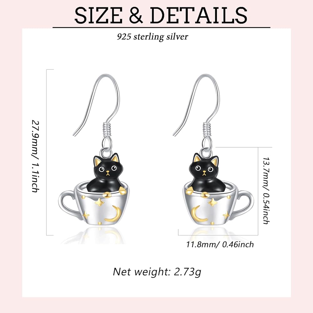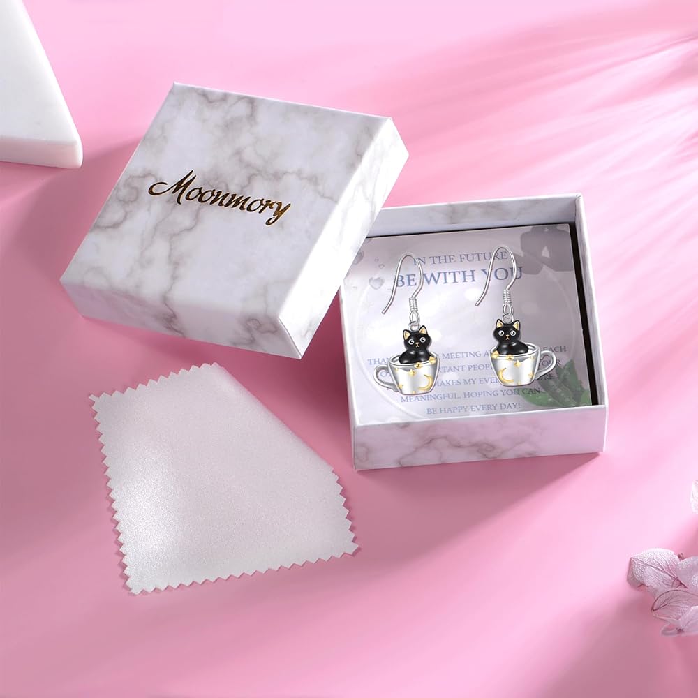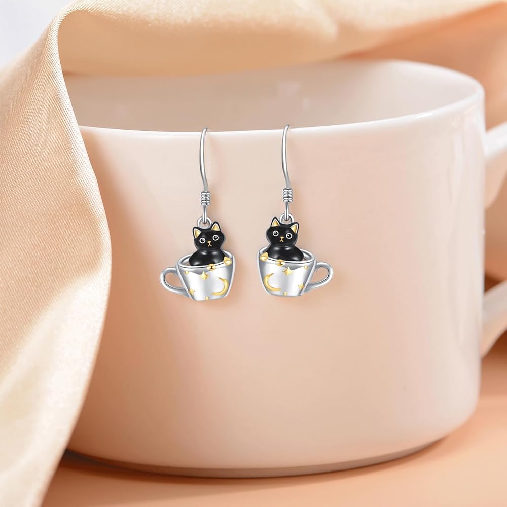 MOONMORY Kawaii Black Cat Cup Drop Dangle Stud Earrings - Cute Sweet Neko Kitten Little Animal Moon Star Funny Cartoon Piercing Jewelry Gift for Teen Women Girls