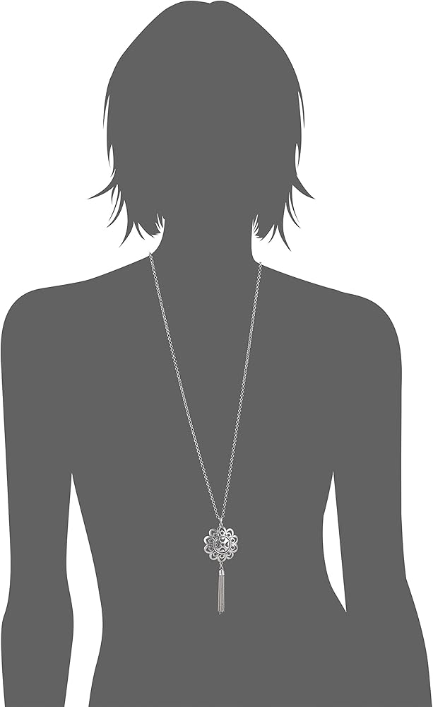 A trendy tassel draws the eye to the pretty floral detail in this awesome long length necklace fashioned by Lucky Brand in silver-tone mixed metal. Approximate length: 30 inches + 2 inch extender. Approximate drop: 4-1/4 inches.