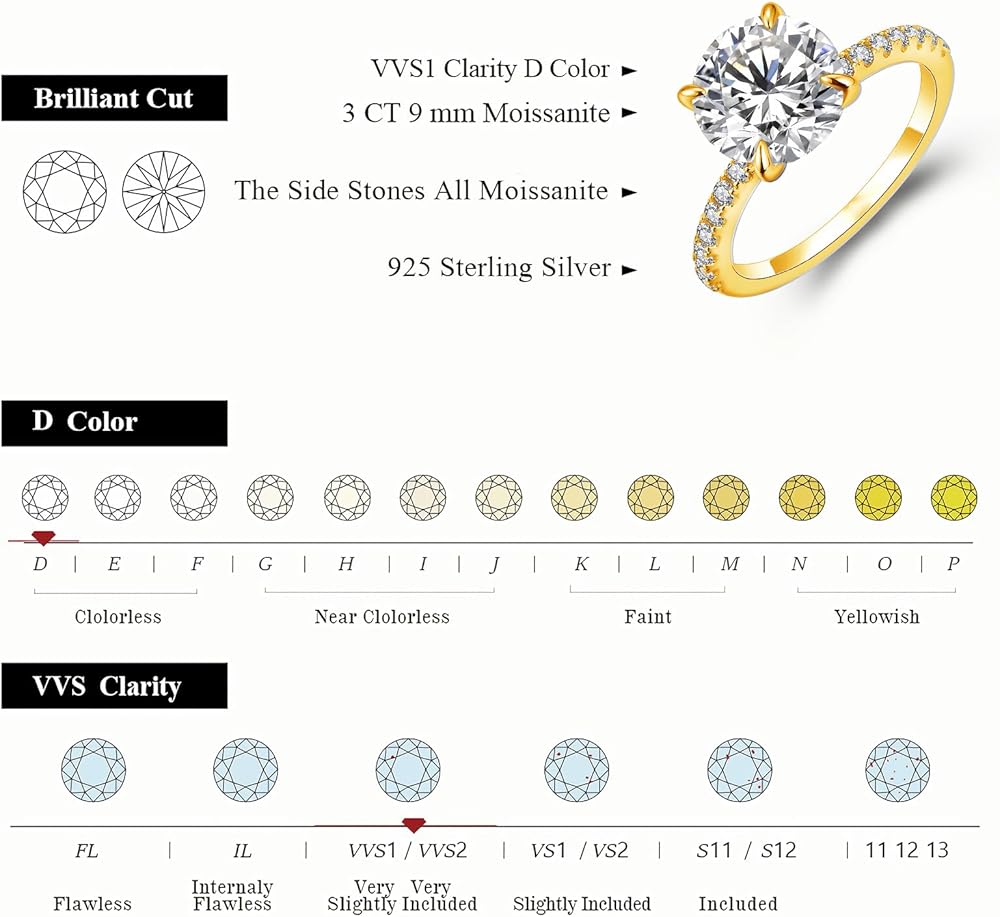 💎Moissanite: At the heart of the ring sits a breathtaking three carat Round Brilliant Cut Moissanite, meticulously crafted to exude brilliance and sparkle. The diamond boasts a clarity grade of VVS1 and a color grade of D, making it a truly exceptional stone.