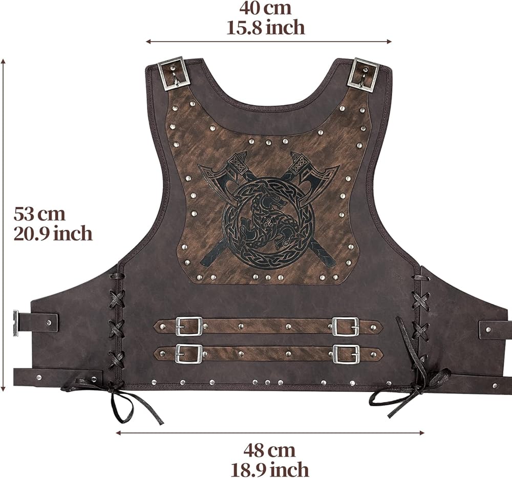 We use adjustable buckle straps closure to fit most people. Made with 8-9 oz high grade PU leather, especially two layer of leather plates on chest (around 15oz leather). Go buy an axe and get ready to fight!