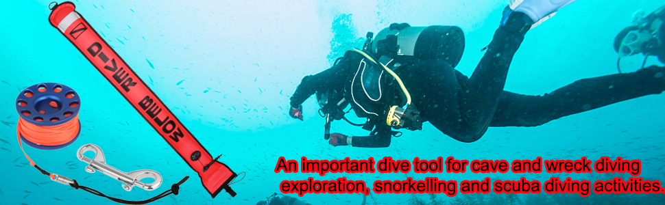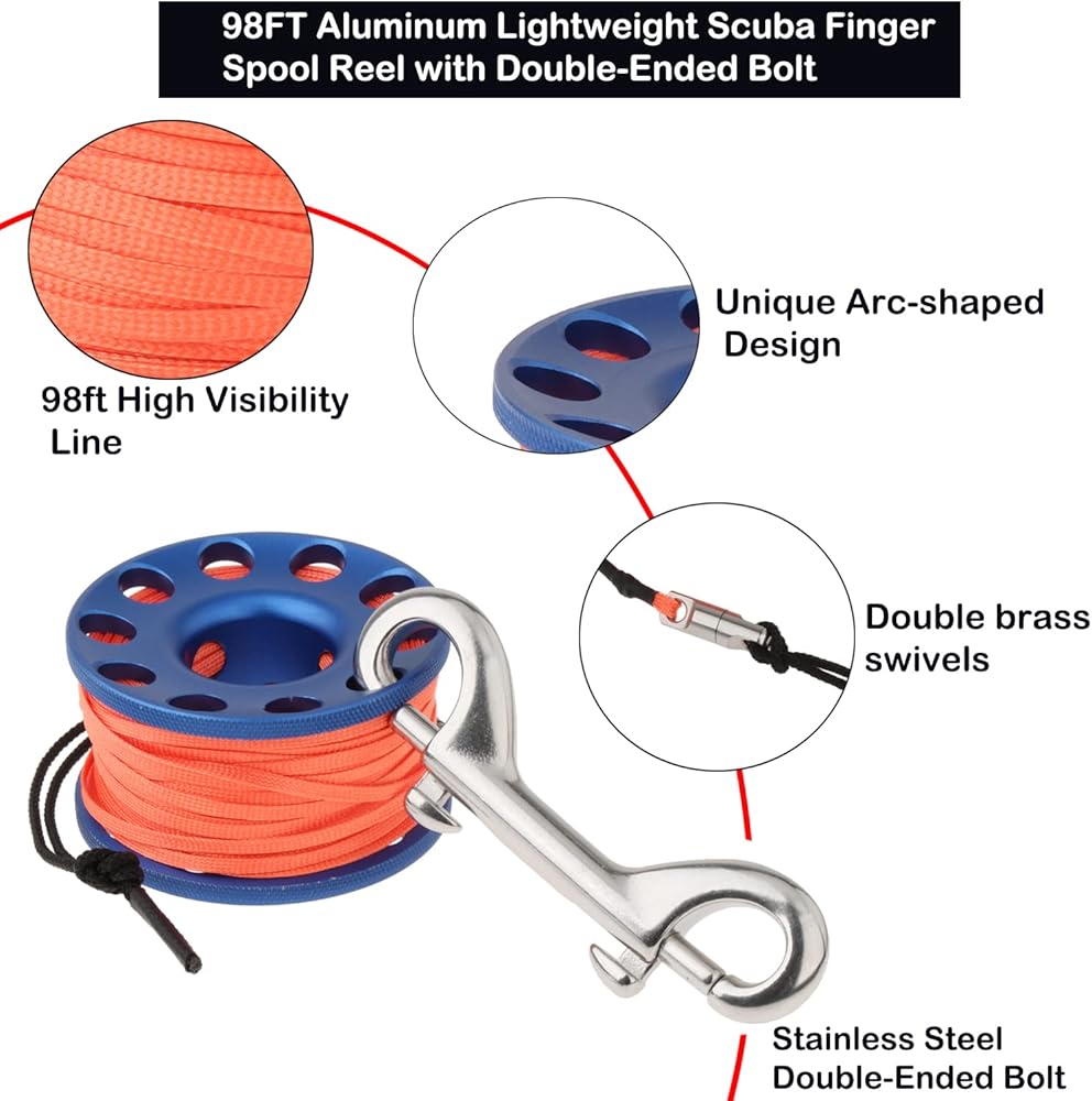 98FT SCUBA DIVING REEL: The brightly colored scuba diving finger reel has 98 feet of high visibility nylon line for easy identification and improved underwater visibility.Stainless steel Double-Ended snap hook you can use to attach both the sausage and the reel multiple places on your BCD.