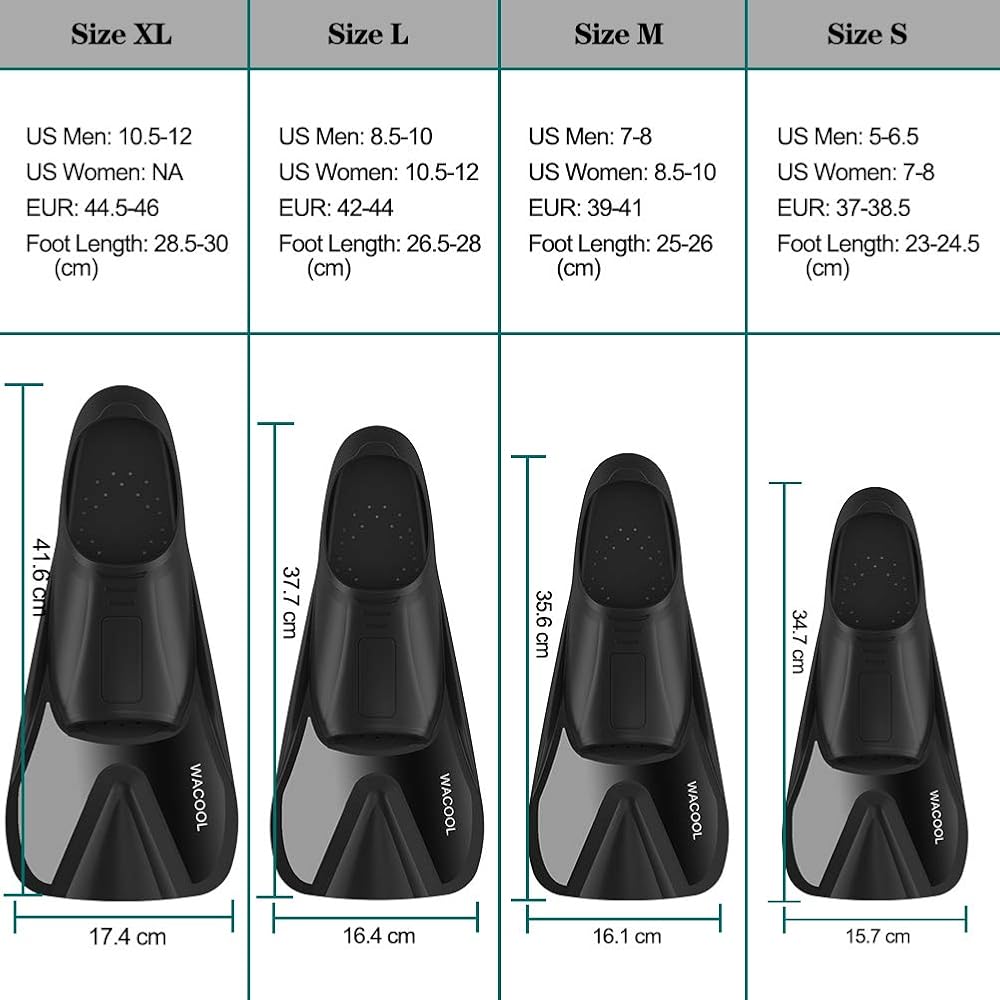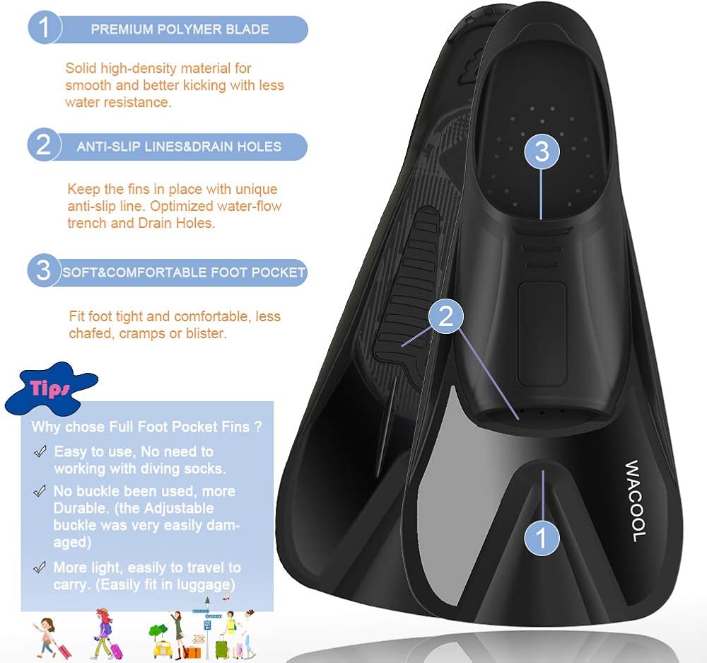 WACOOL Adults Snorkeling Snorkel Scuba Diving Package Set Gear with Travel Full Foot Short Swim Pocket Fins Anti-Fog Coated Glass Silicon Mouth Piece Purge Valve and Anti-Splash