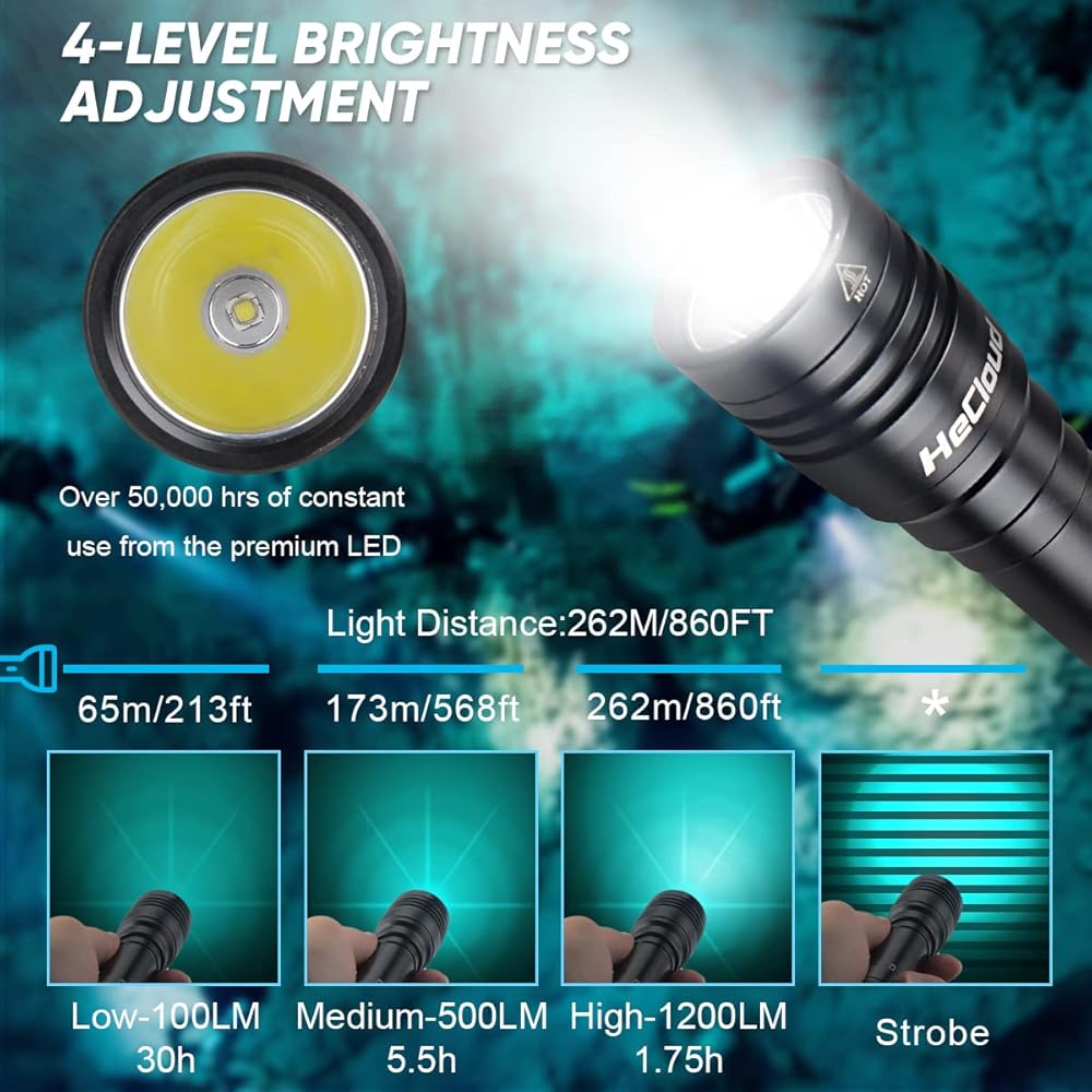 【Upgraded Led Beads】Super bright XPL- LED flashlight the maximum output brightness is up to 1200 lumens, Dive Light can be used in maximum 328 ft underwater, gives you super bright white light underwater. Lifetime >60,000 hours.