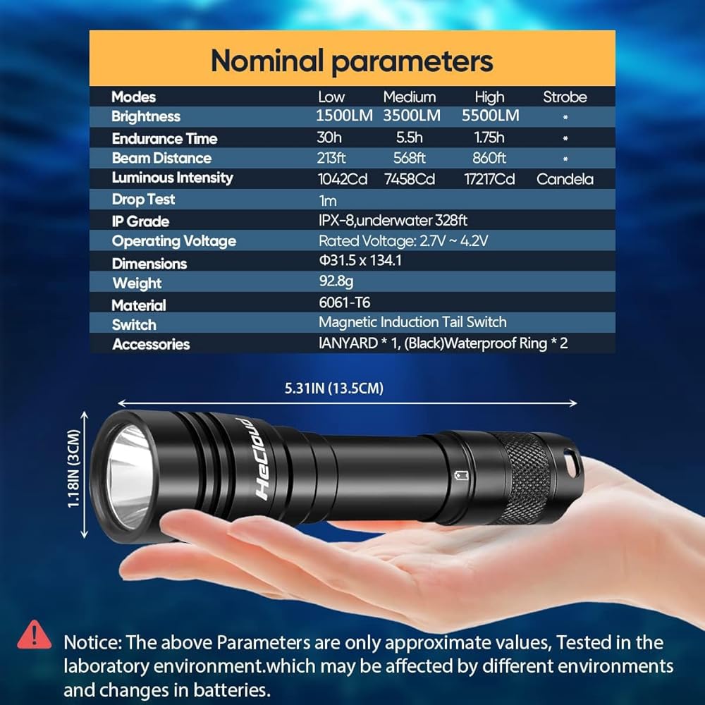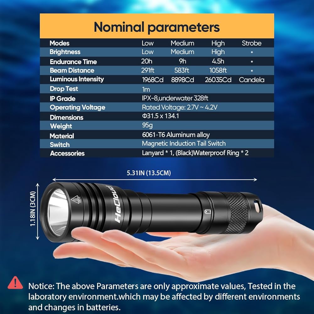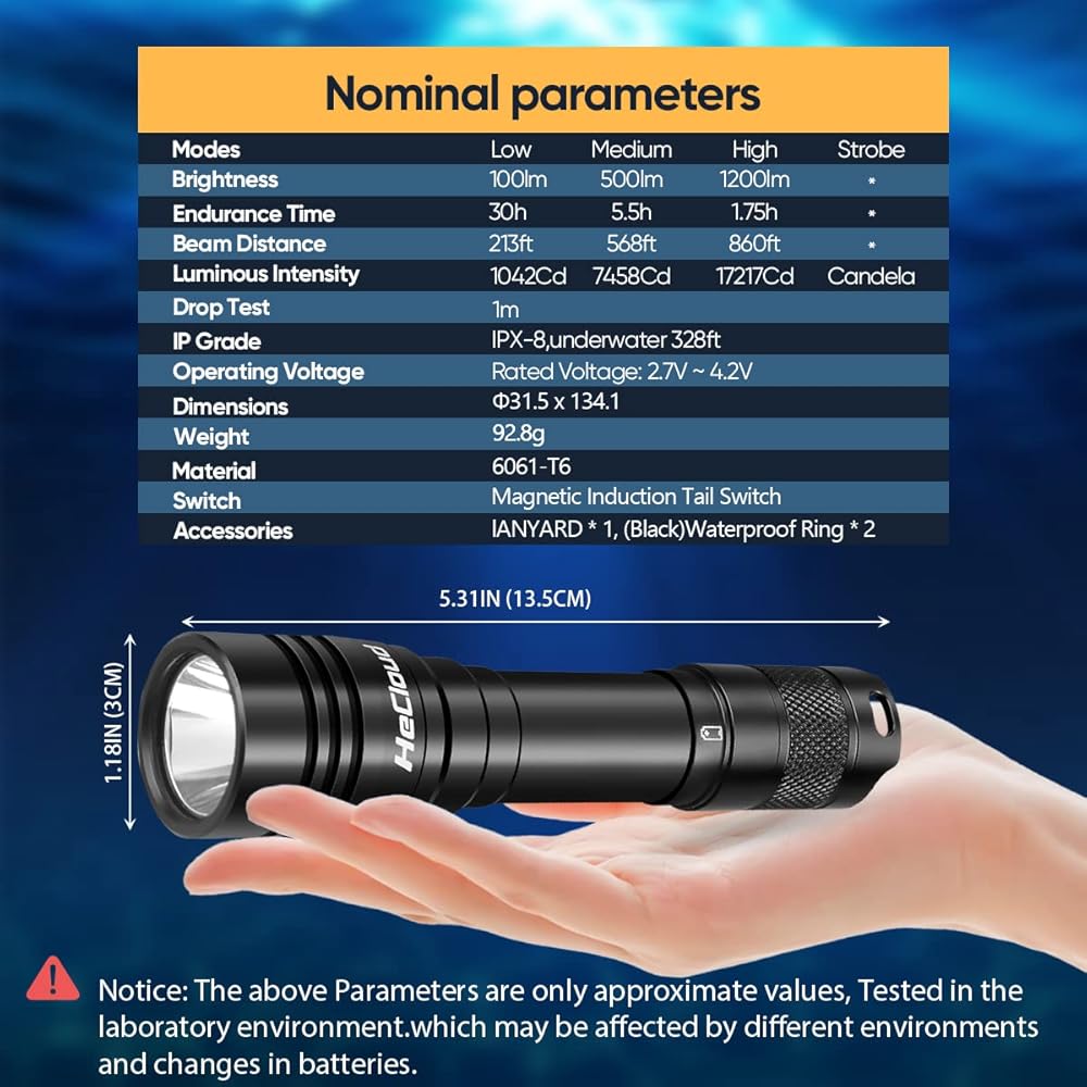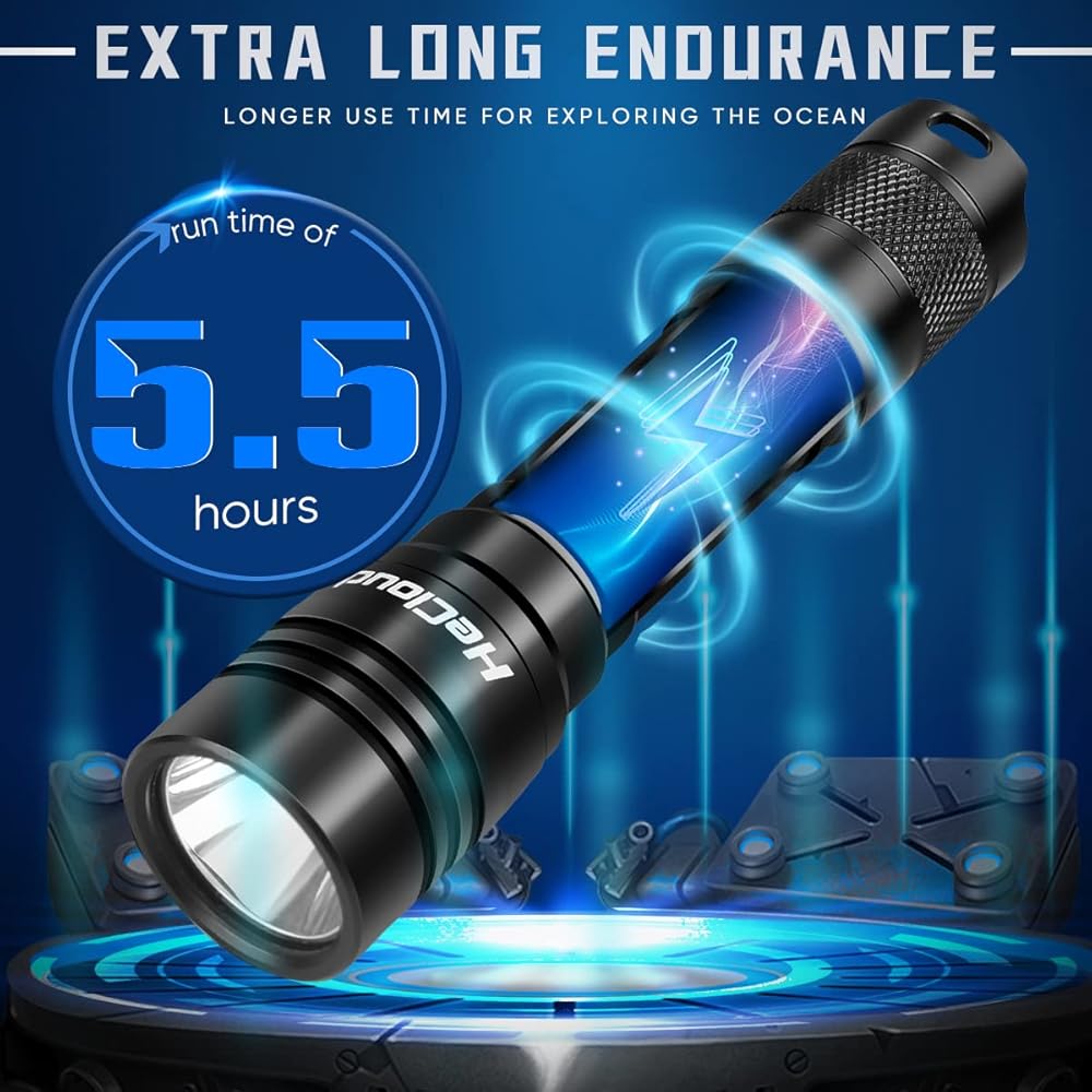 【IPX8 Waterproof Rating】A professional scuba diving equipment for scuba diving and snorkeling enthusiast. Ideal outdoor flashlight for fishing, diving, swimming, hiking, sailing, caving, camping, home. Super bright compact dive light can be submerged up to 328 ft.