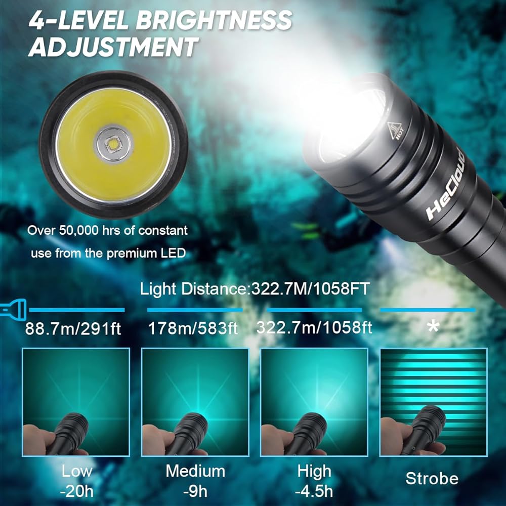 【4 Modes】High / Medium / Low / Strobe. The diving flashlight can be switched to the different lighting modes by pressing the button, it allows you to adjust the brightness according to the underwater environment.