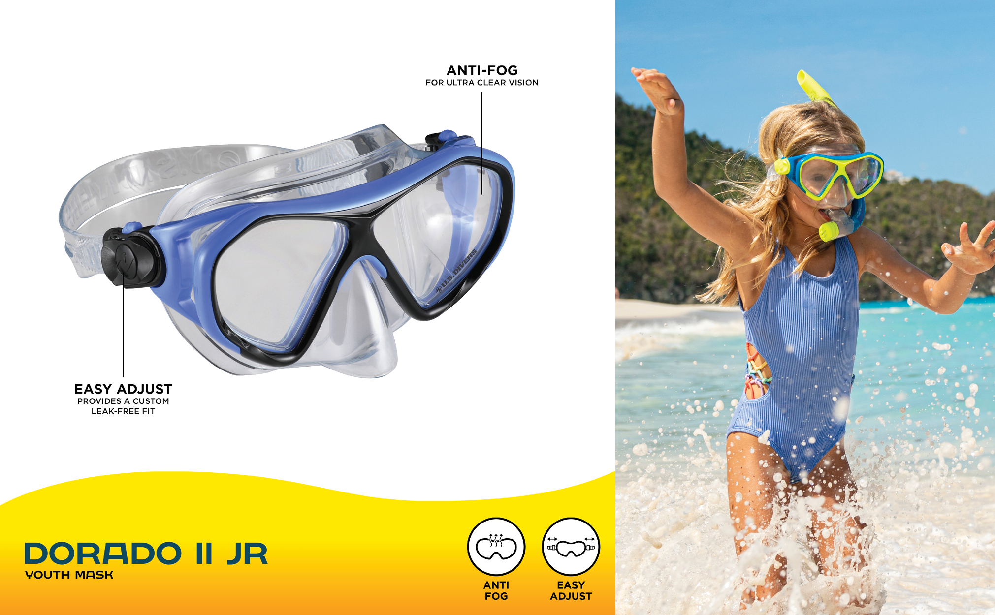 DORADO JUNIOR SNORKELING MASK - Innovative snorkel mask designed to perfectly fit a child's face blends the perfect combination of fun colors and performance