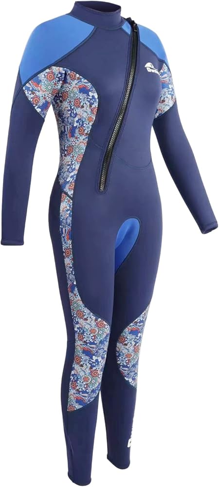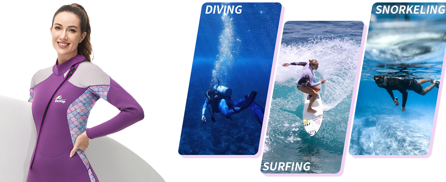 DESIGN FOR LADY-The front zipper makes the wetsuit easier to put on, while still having a designer feel. The fish scale/wave pattern on the side of the body is designed to accentuate the female figure and make you more sexy. Inspired by the ocean, we have designed two colors on wet suits for you to choose from, a darker version - blue/navy; and a lighter version - pink/purple.