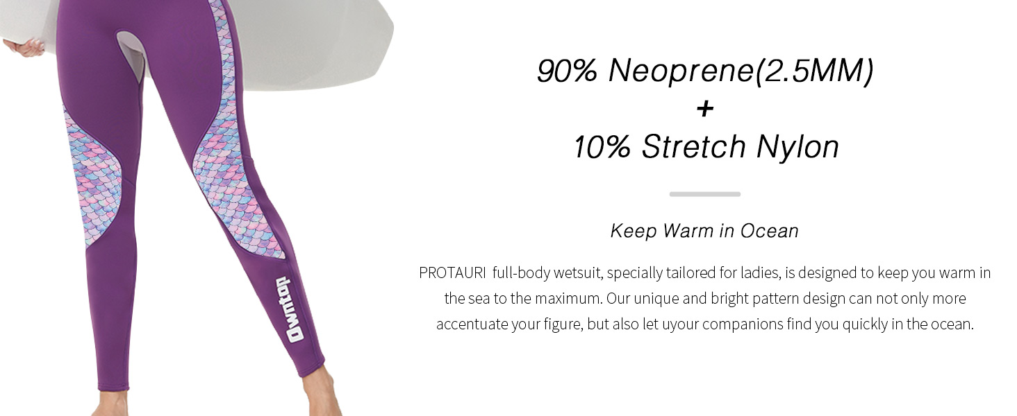 KEEP WARM-PROTAURI wetsuit women captures warmth through premium neoprene. The main purpose of a diving suit is to keep you warm in cold water. The diving skin works by trapping a thin layer of water between the neoprene and your skin, so you get wet. The water between skin and the wetsuits will form a thermal barrier, which will prevent the heat generated by your body from spreading out and keep you warm.