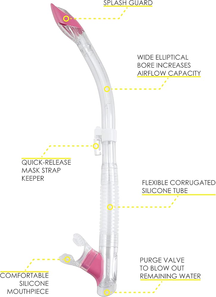 The Tao is a semi-dry snorkel that allows divers to take every breath with confidence and focus on the reef below not on worrying about water in your air way. The top Splash Guard is designed to reduce water intake. A generous bore contoured tube provides ample airflow and a lower purge valve enables instant clearing when needed. Jaw fatigue is reduced thanks to a flexible lowerbore and an angled mouthpiece.