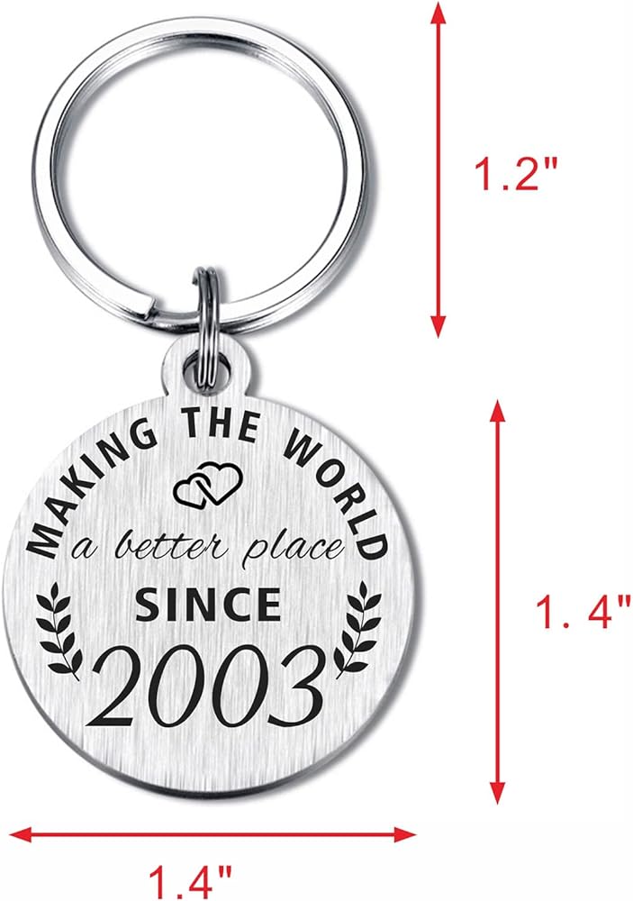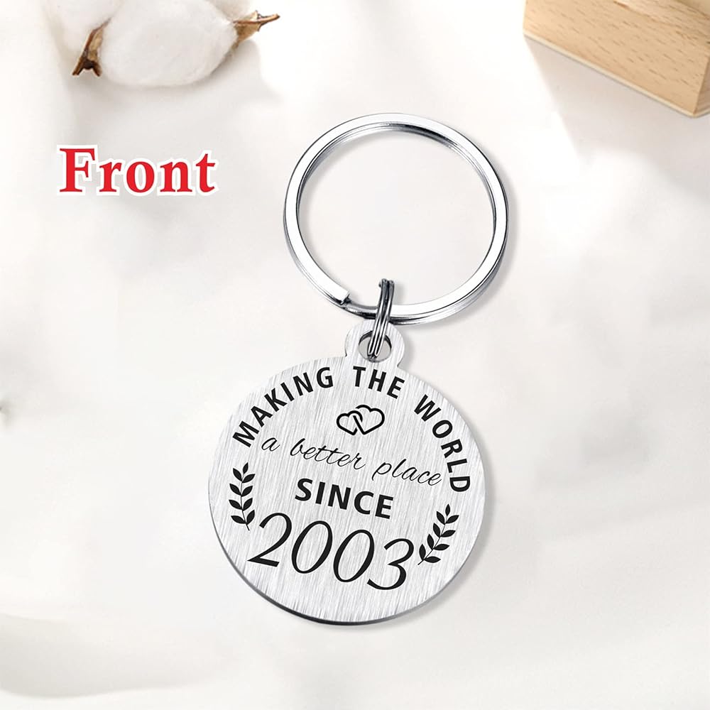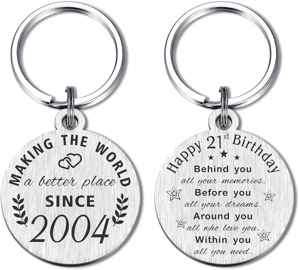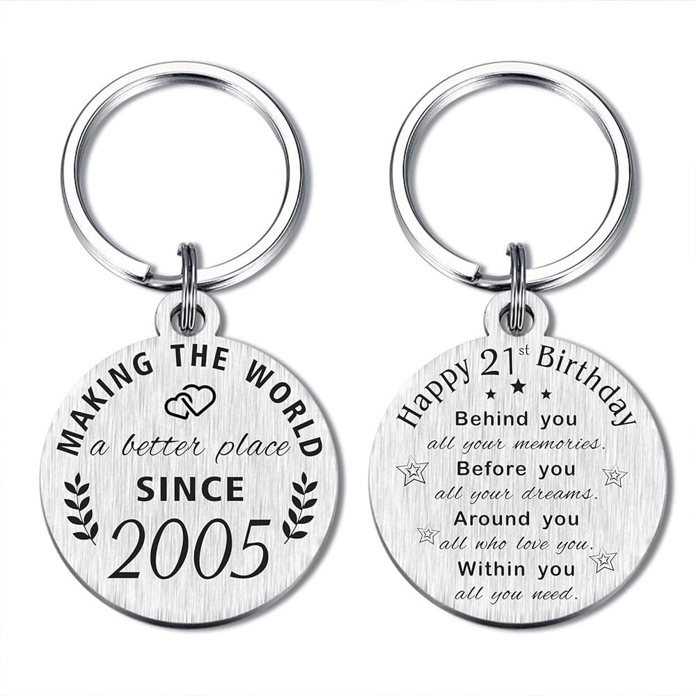 ❤ 21 Year Old Birthday Keychain, Double sides laser engraved, Front side engraved "Making the world a better place since 2002". Back side engraved "Happy 21st Birthday, Behind you, all your memories. Before you. all your dreams. Around you, all who love you. Within you, all you need"
