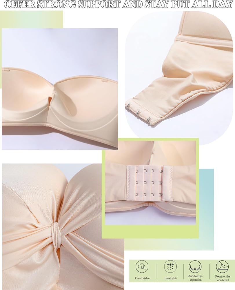 🌻 FIT PERFECTLY NON-SLIP STRAPLESS BRA: 💚Full figure strapless bra with smooth satin cups, perfect for plunging necklines, soft fabric keeps you comfortable all day. Smooth material as surface fabric, which is seamless under clothing. Featuring slip-resistant fabric material backing along the band edge to keep it stay in place and non-slip. Our brand of bras stays comfortably in place with or without straps. You could wear it all day and don't have to pull it up at all.