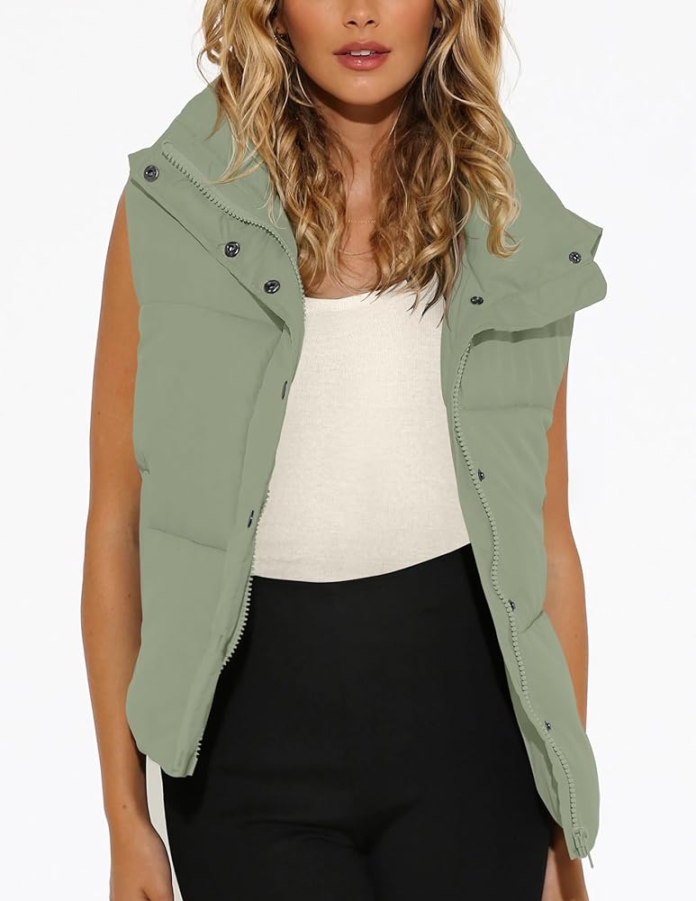 Design:Women winter puffer vest,full zip,stand-up collar,zipper,cropped sleeveless design,button down,front zipper closure,adjustable drawstring hem,side pockets,solid color,warm and soft,lightweight,winter vest for women.