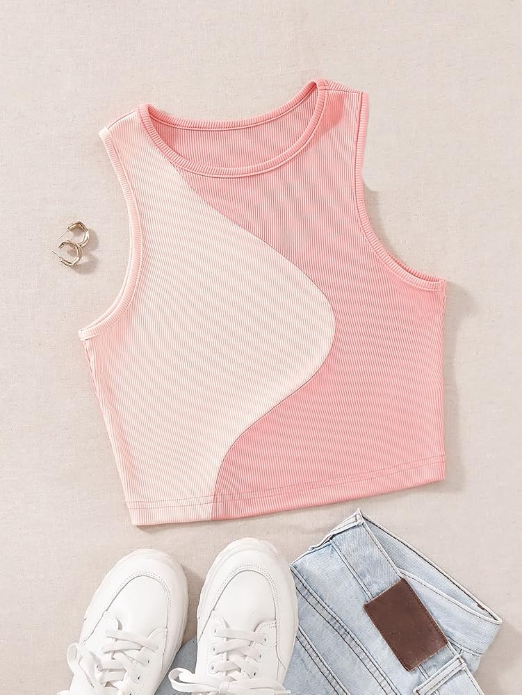 - Color block, sleeveless, round neck, rib knit, crop tank top
