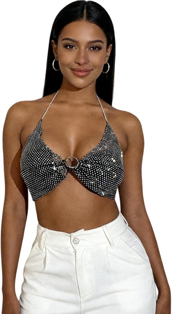 JUMISEE Women Shiny Crystal Rhinestones Backless Crop Tops Tank Top Sexy Halter See Through Mesh Camisole for Night Out Party Clubwear