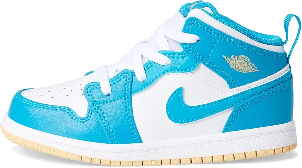 Dressed in a Aquatone, Celestial Gold, and White color scheme. This offering of the Air Jordan 1 Mid comes constructed in a full leather build with mesh tongues and lining. It features a White base with Aqua Blue overlays and Swooshes paired with Peach-like hues on the branding and rubber sole. Lead your kiddo into the heart of sneaker culture with kicks modeled after MJ's first signature shoe. Premium materials, soft cushioning and a padded ankle collar offer support for little feet and celebrate the shoe that started it all.
