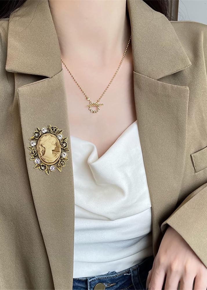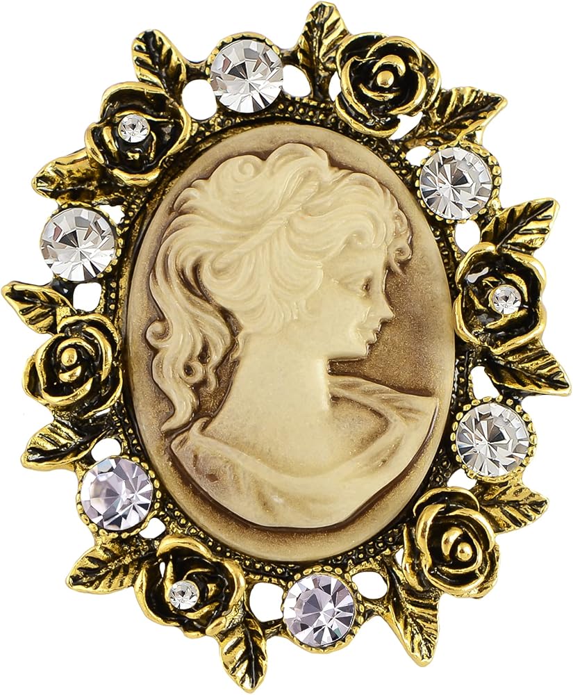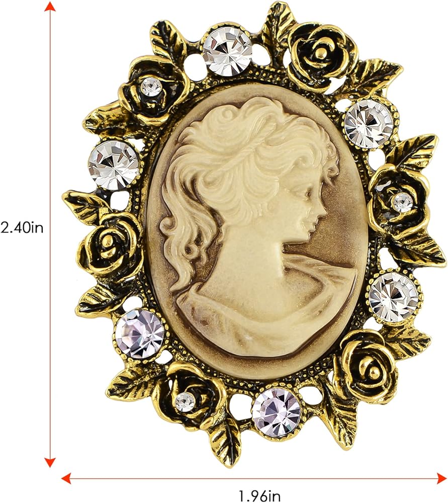 Gorgeous vintage cameo style. A beautiful cameo brooch featuring enamel lady maiden in a filigree frame with floral, ribbon and crystal rhinestone detail on a metal alloy base. For those that love vintage style accessories this brooch is the perfect little touch to really make a look pop. From the ribbon detail to the adorable crystal rhinestone flowers, this brooch is elegance defined