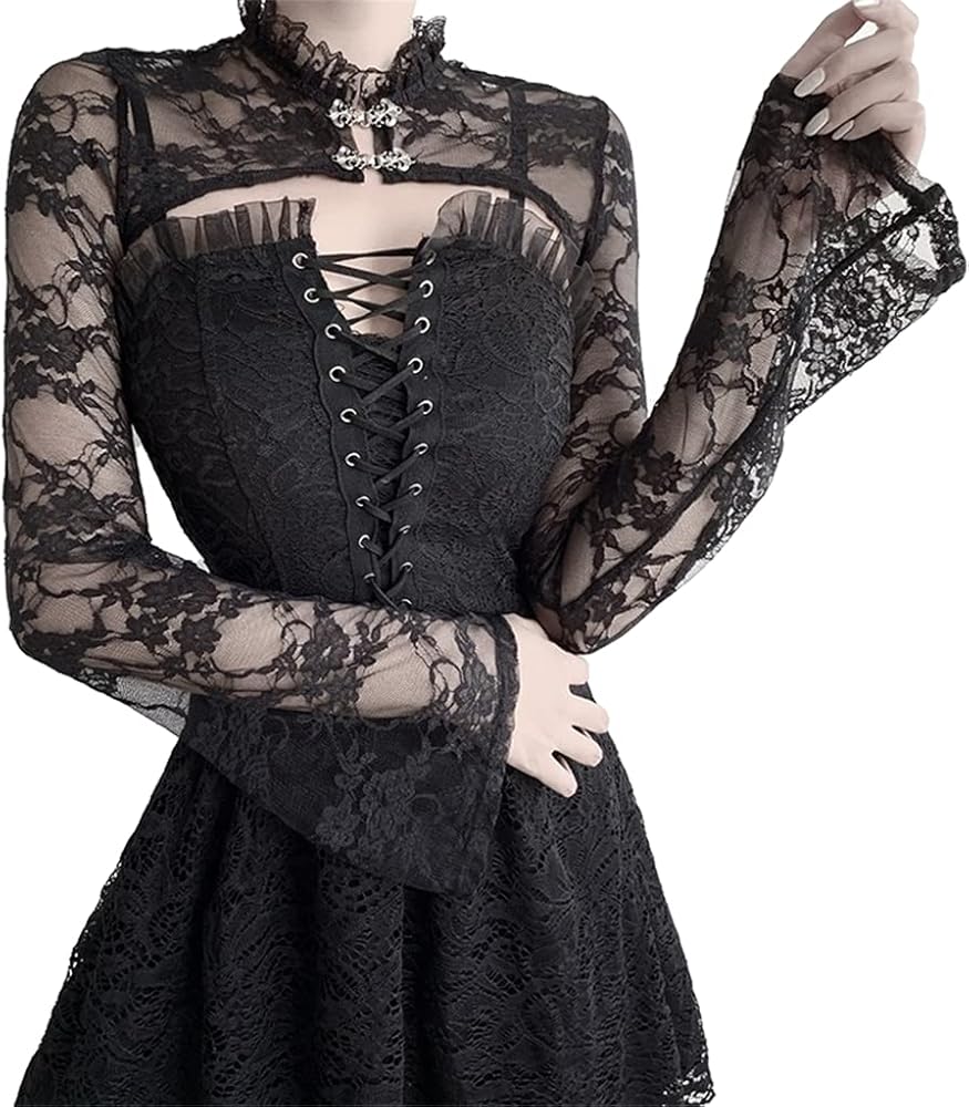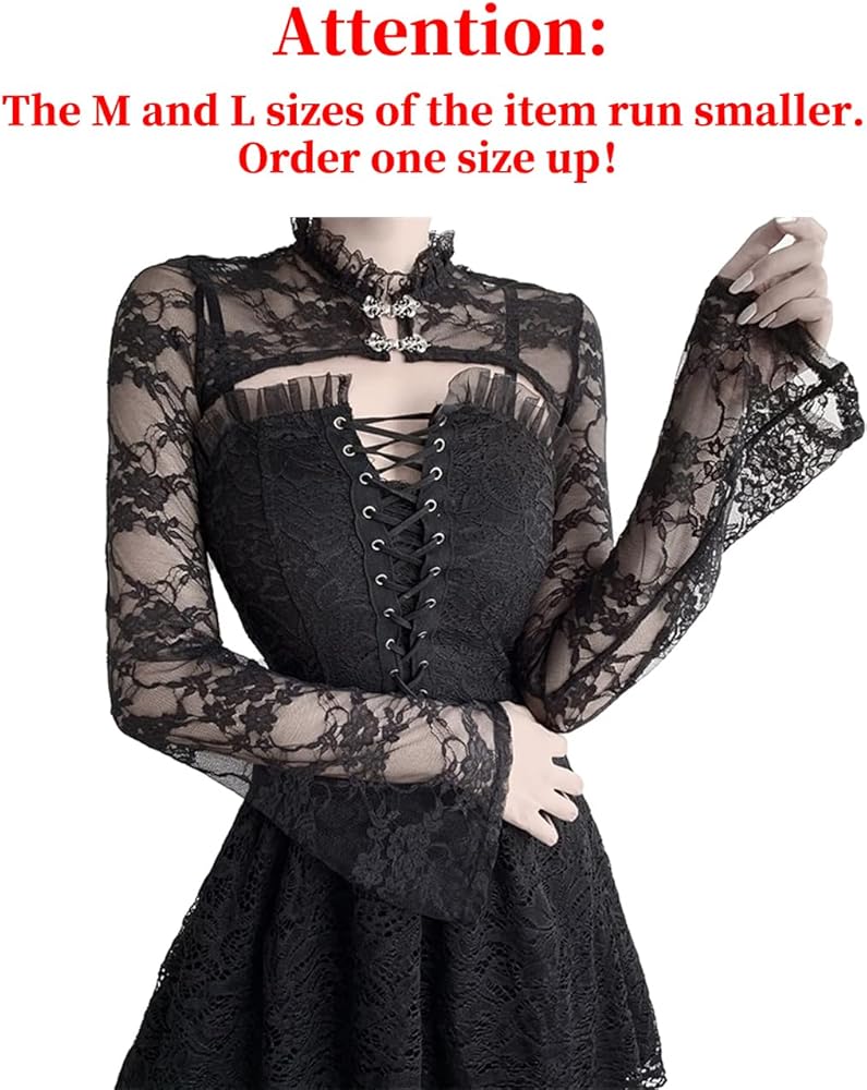 • Gothic black bell sleeve top for women, punk lace cardigan, goth shawl, elegant steampunk sheer long sleeve crop top.