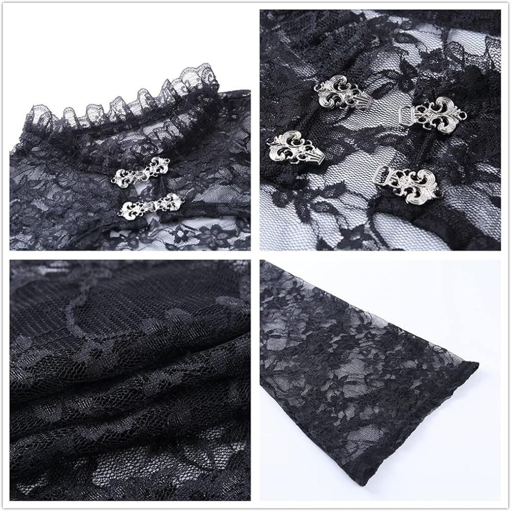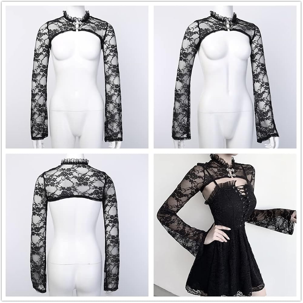 • The punk lace shawl for women features solid color, long sleeves, big bell sleeves, V-neck, sheer mesh, black, large trumpet sleeve, cropped length, and goth style.