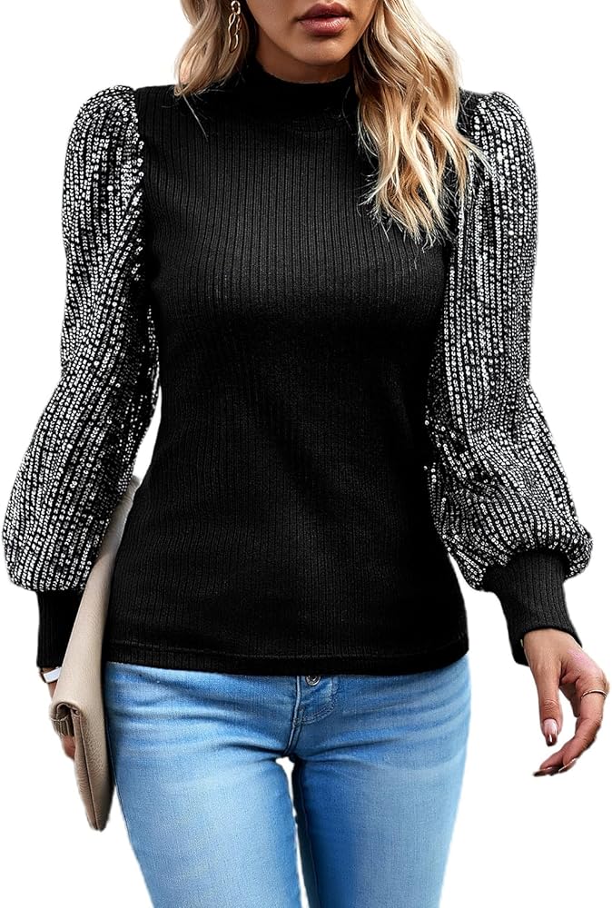 Women's Sequin Tops Sparkly Glitter Blouses Sequined Balloon Long Sleeve Shirts Shimmer Dressy Tops for Party Clubwear