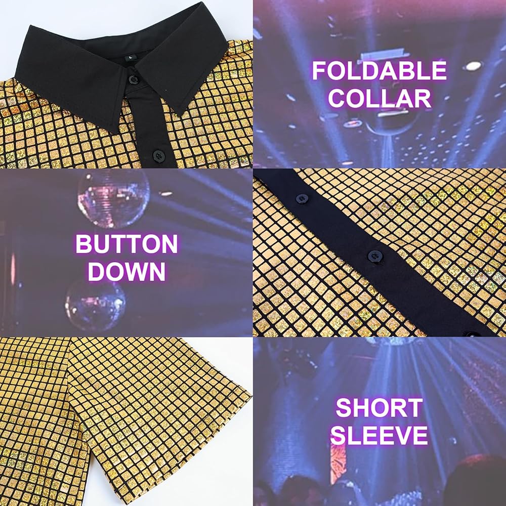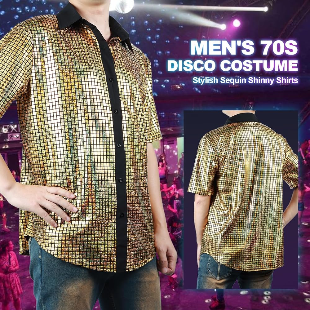 Design: Mens sparkly shirt is designed with full body sparkling sequins and vibrant colors. 70s outfits for men shines and catches attention under lights, makes you stand out from the crowd.
