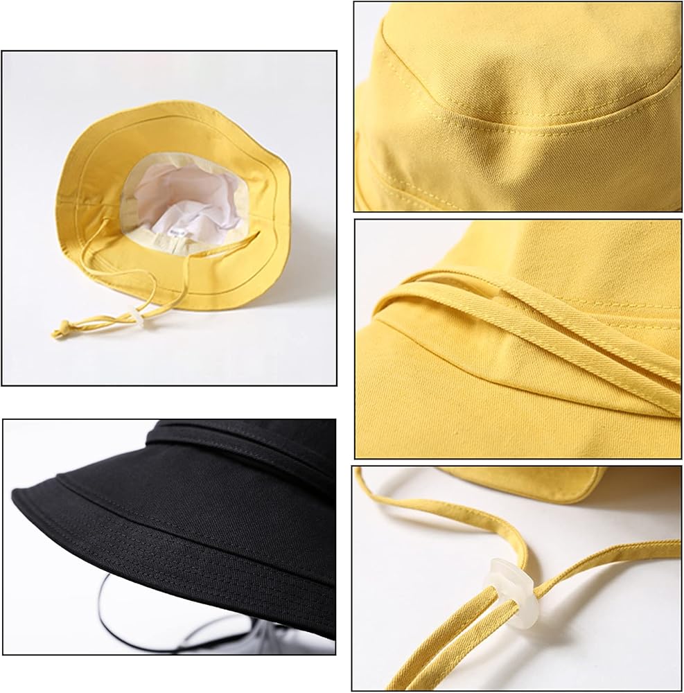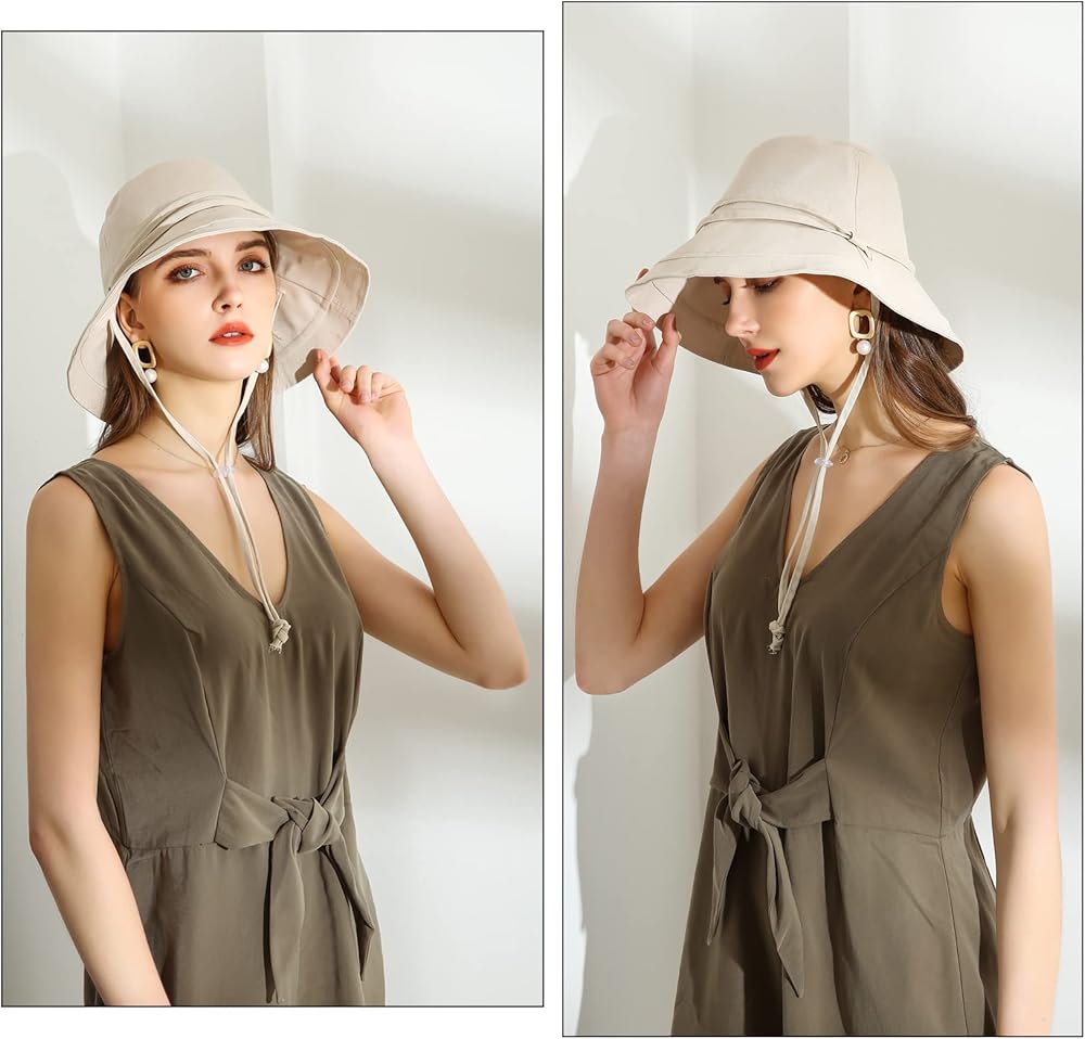 DETACHABLE & ADJUSTABLE CHIN STRAP: This beach bucket hats for women is easy to adjust the string under neck to keep the hat in place on windy days, so it won't blow away in the wind on a bike, on a boat, or anything like that. Fits securely & perfect when enjoying your day outdoors. Easy to remove the tie too.
