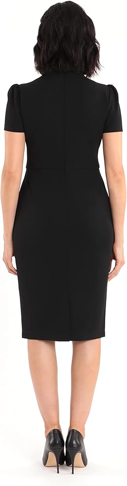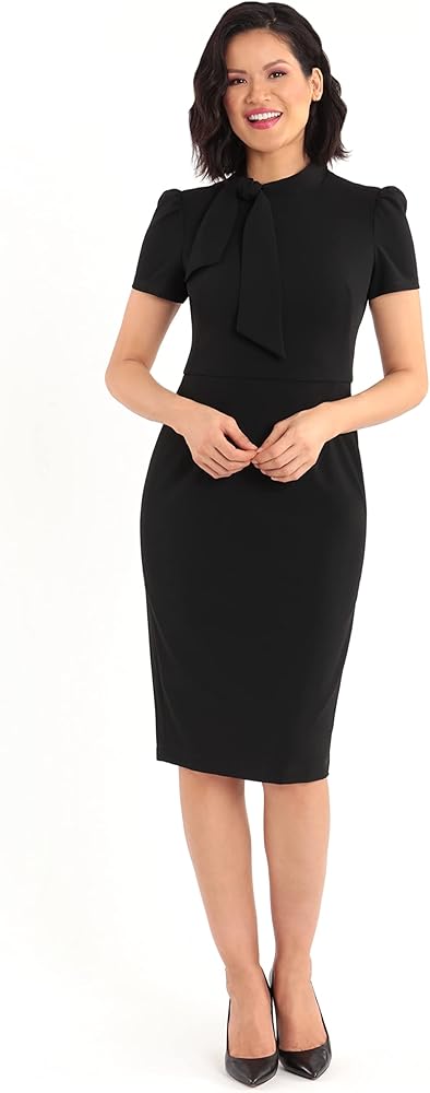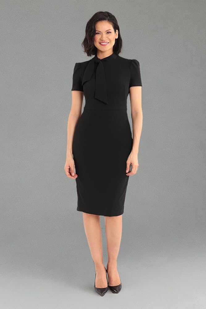 This classic Maggy London style is called the flight attendent dress. It's the perfect silhouette; a classic, slimming crepe sheath with neck tie detail.