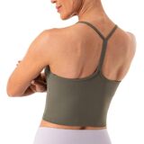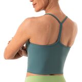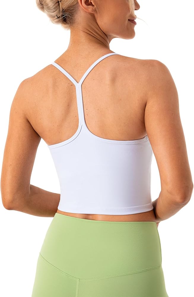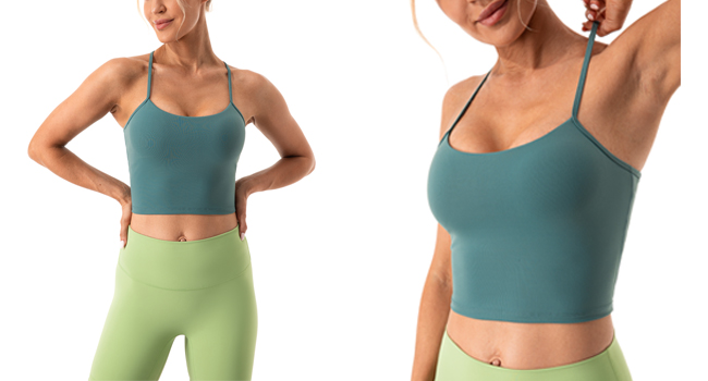 - Features: Y racerback, scoop neck with spaghetti straps, built-in shelf bra and removable pads