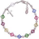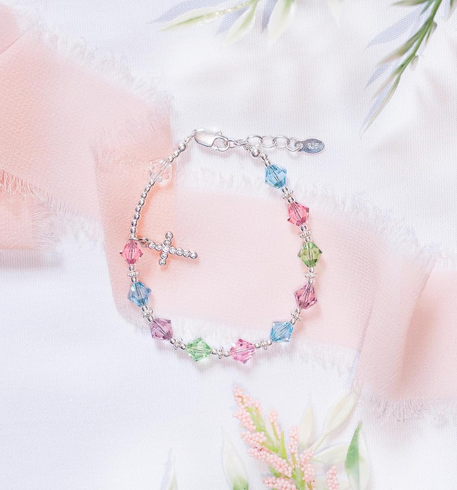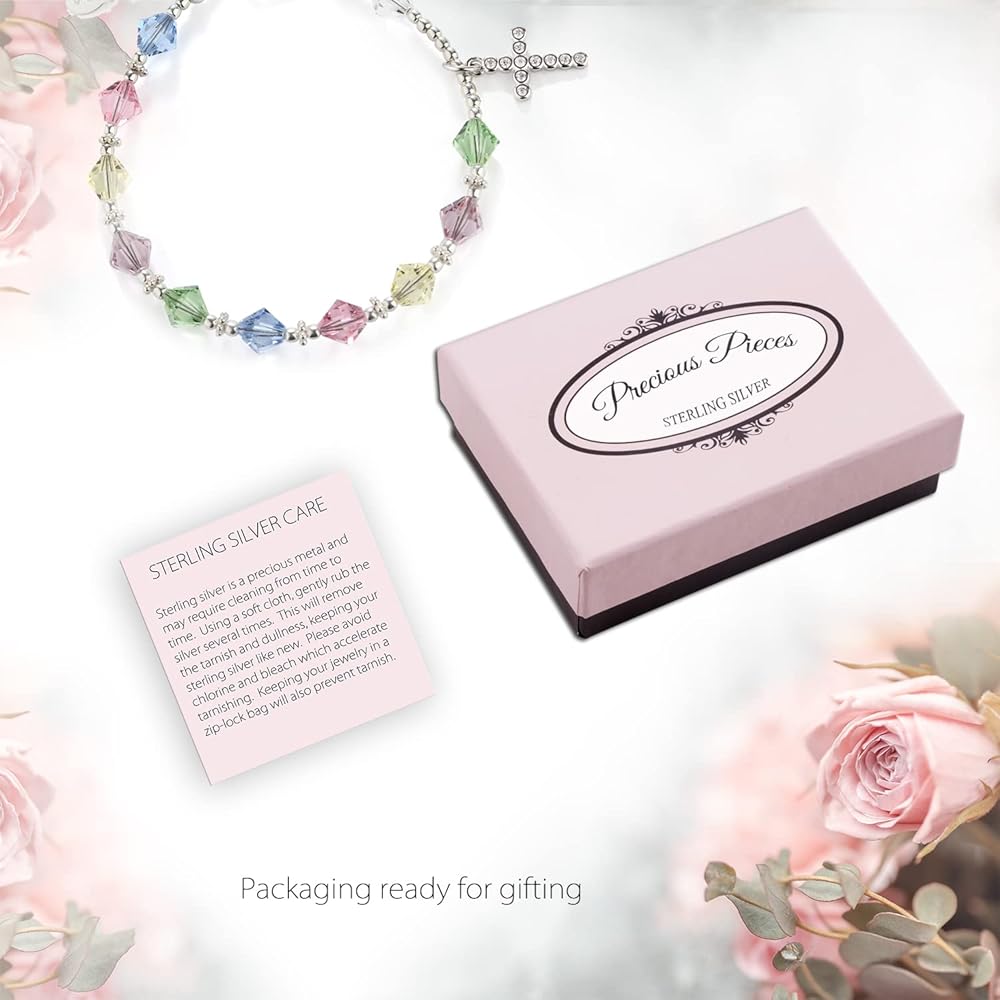 Sterling Silver First Communion rosary bracelet with High-end Crystals and Sterling Silver CZ Cross for girls. This bracelet features an adjustable extension chain that grows with your child for a perfect fit. Comes in a beautiful gift box and makes a timeless First Communion gift for girls they will remember forever. 6 - 6 1/2 inch length