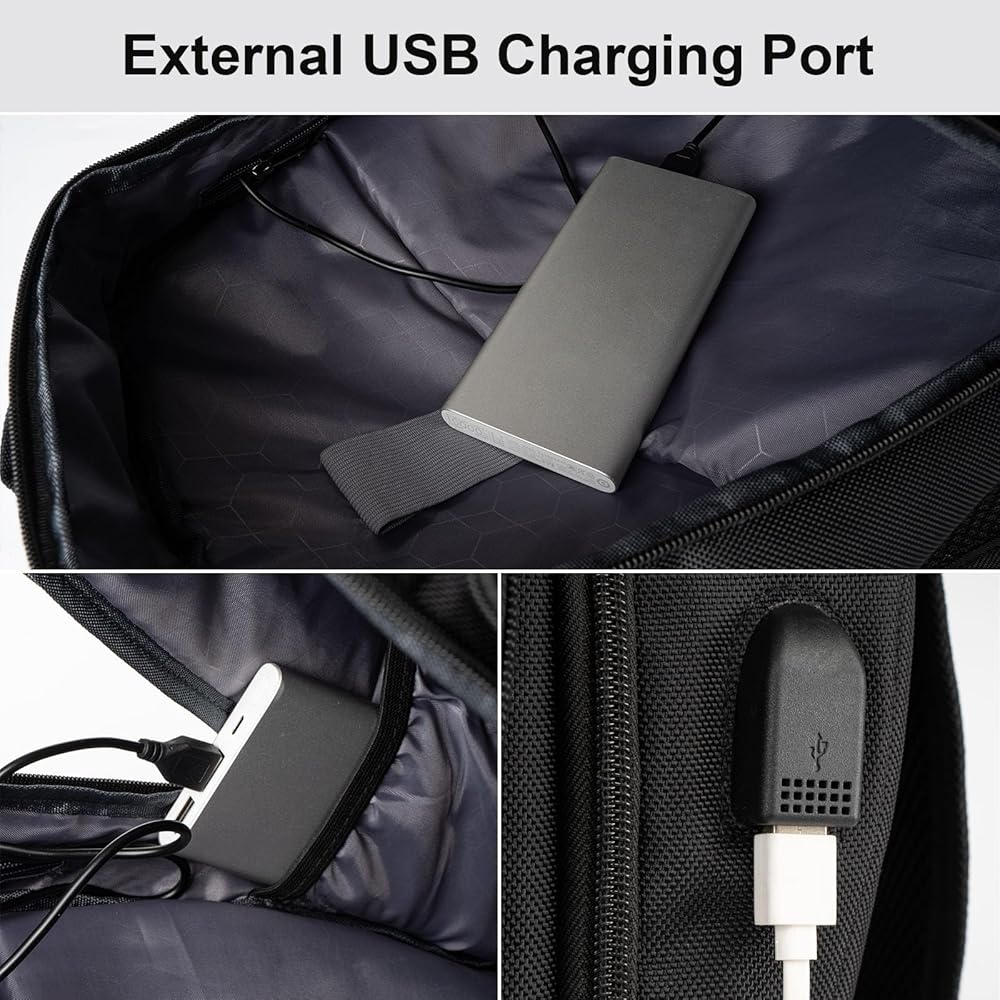 USB Charging Port Design: There is a pocket inside the laptop backpack for storing the power bank (power bank not included). This computer backpack with charger port and built-in charging cable provides a more convenient way to charge your phone while on the go.