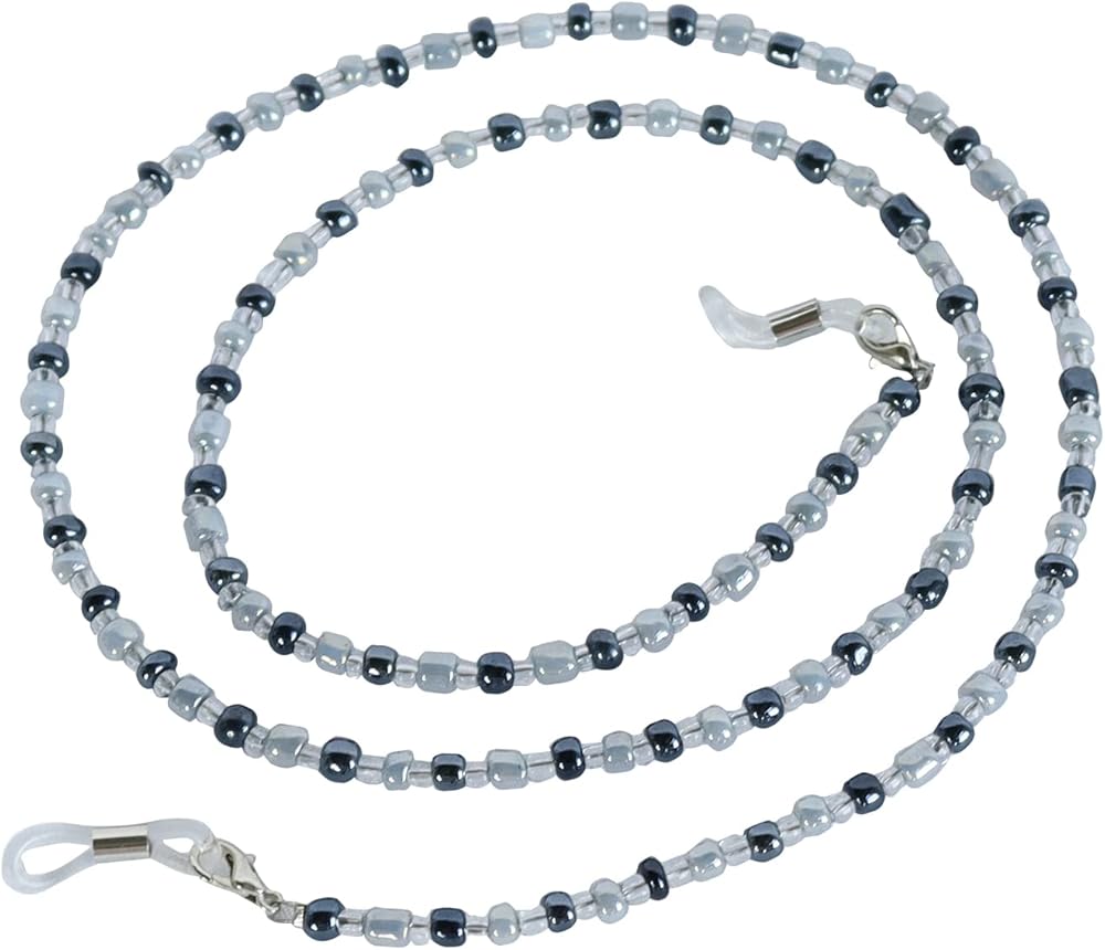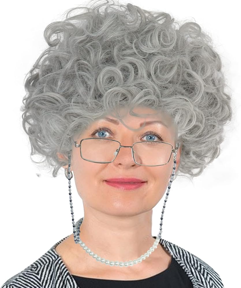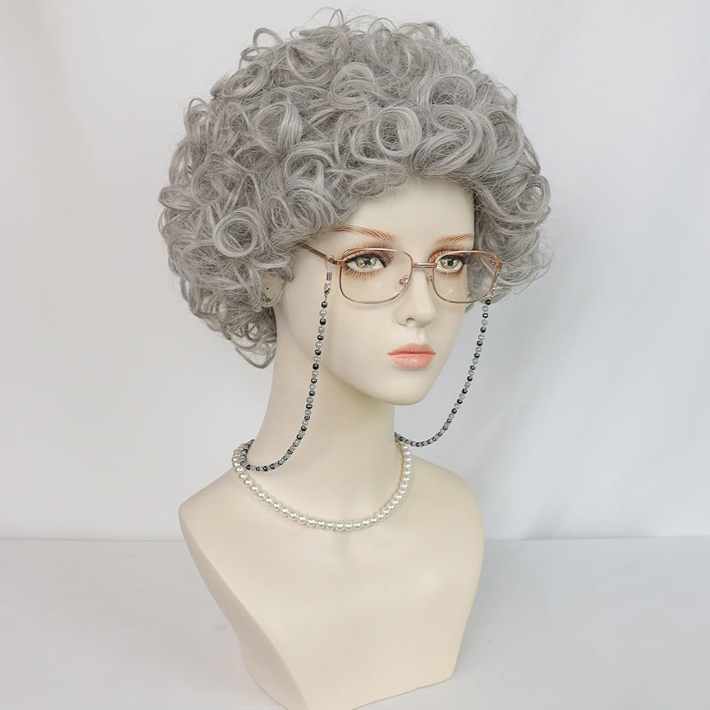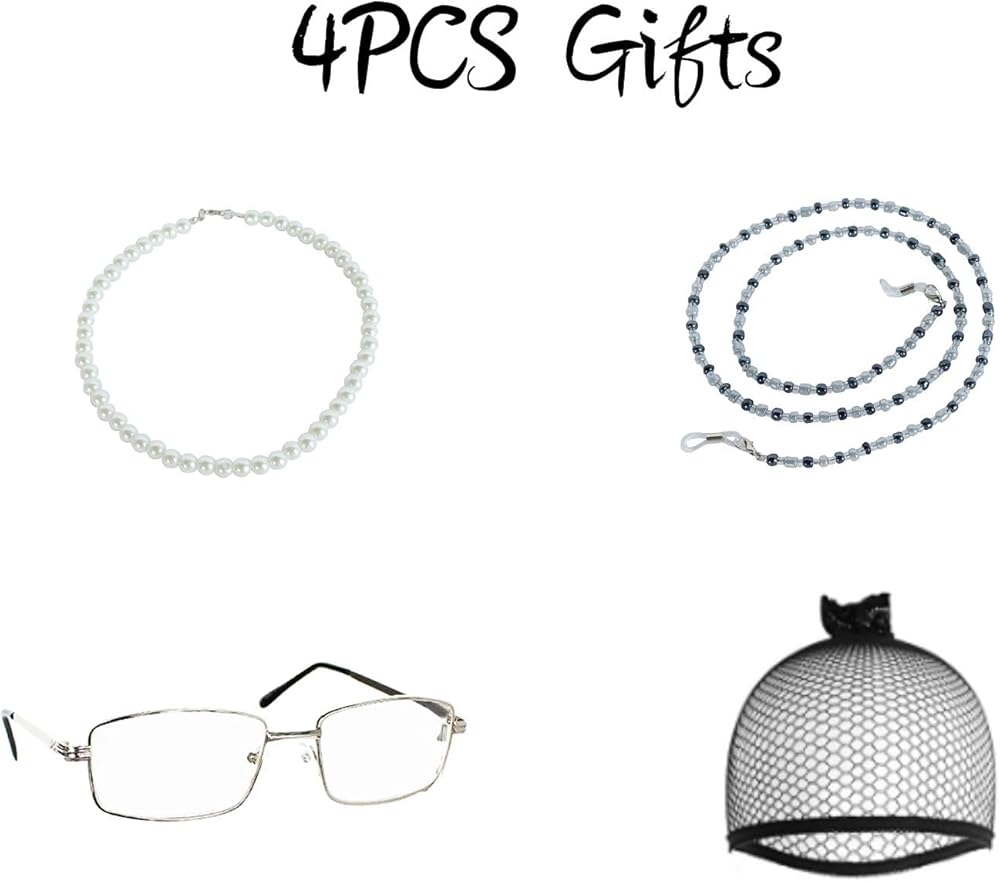Ebingoo 5PCS Women100 Days of School Grey Old Lady Wig Set+ Granny Glasses+ Eyeglass Chains Strap+ Faux Pearl Beads Necklaces+ Wig Cap Grandmother Granny Wig for Costume Halloween Party