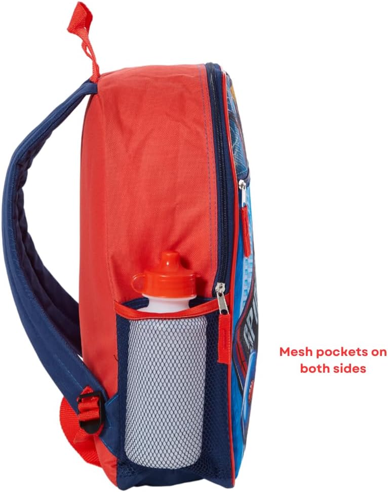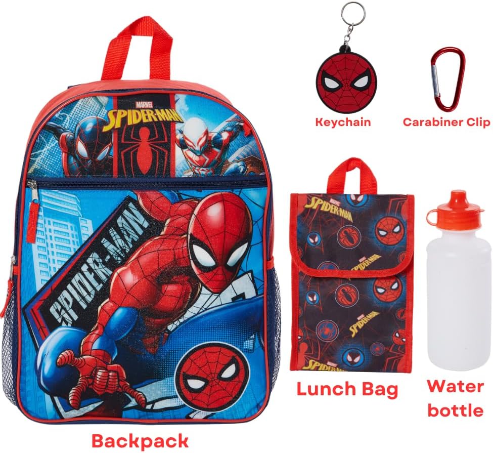 SPIDERMAN BACKPACK SET – The complete back to school bundle includes a large 16 inch backpack (12 x 16 in.), with two mesh side pockets & large front zip pocket, a foldable soft lunchbox, a water bottle, a rubber keychain, and a carabiner clip.