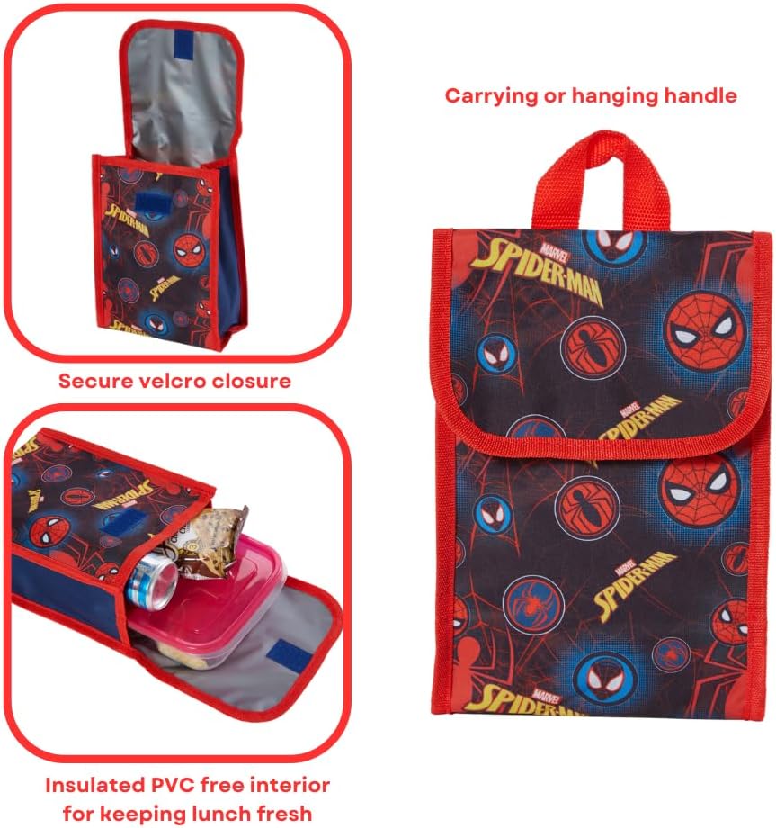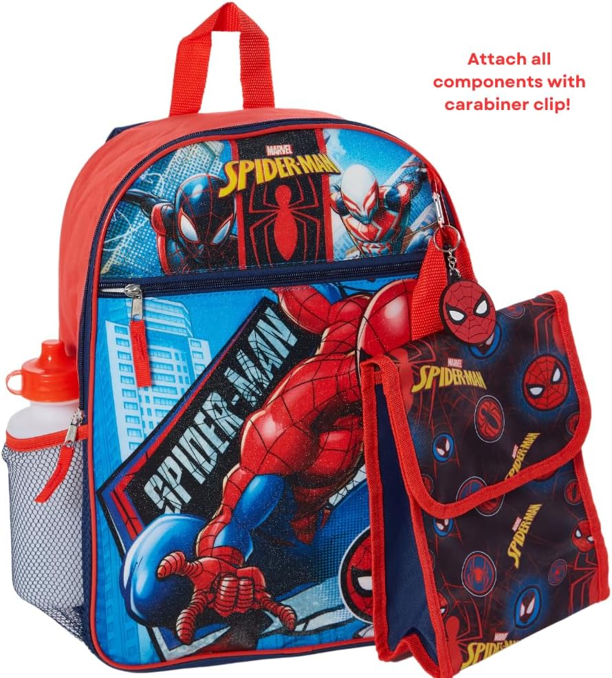 The Marvel Spiderman Backpack Set for Kids is the ultimate back-to-school bundle for young fans of the friendly neighborhood superhero. This set includes a 16-inch backpack featuring Spiderman's iconic design, with a spacious main compartment capable of holding folders, binders, and notebooks. The backpack also includes two mesh side pockets for the accompanying water bottle and a large front zip pocket for organizing school supplies. Included in the set is a foldable soft lunchbox adorned with the Spiderman theme. The lunch bag can be conveniently stored when not in use and can be attached to the backpack using the provided carabiner clip, allowing for hands-free travel. Designed for durability, this backpack set is perfect for elementary school kids and features adjustable straps to accommodate their growth. Whether it's a gift for a boy aged 3 and above, this Spiderman-themed set is sure to excite and bring joy. It captures the thrilling world of Spiderman and his amazing friends, making it an excellent choice for fans of the superhero and the Spiderman movies. Going back to school will be more exciting with the familiar comfort of their favorite characters, including Spidey and his amazing friends. This backpack set perfectly complements other Spiderman school supplies, providing a complete and coordinated look for young Spiderman enthusiasts.