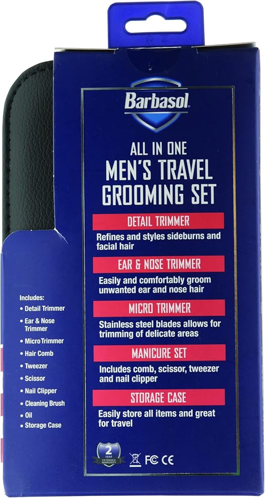 Do you want to be clean shaven and refreshed while on a business trip or vacation? With the Barbasol 10-Piece All-In-One Men's Travel Grooming Kit, you can look your best while being on-the-go. Our Battery-Powered Detail Trimmer allows you to style and define how your facial hair will appear and will help make your beard or sideburns stand out. The Ear and Nose Trimmer can get rid of those pesky hairs that compromise your look. With the Micro Trimmer, you can tackle sensitive areas in a precise and safe manner. The manicure set comes with a comb, scissors, tweezers, and nail clipper to make your appearance the best it can be. All of which comes in an easy-to-use storage case that can help you take them wherever you need when traveling. We've also included oil and a cleaning brush for your convenience. Enhance your look from head to toe with the 10-Piece All-In-One Men's Travel Grooming Kit.