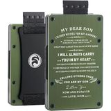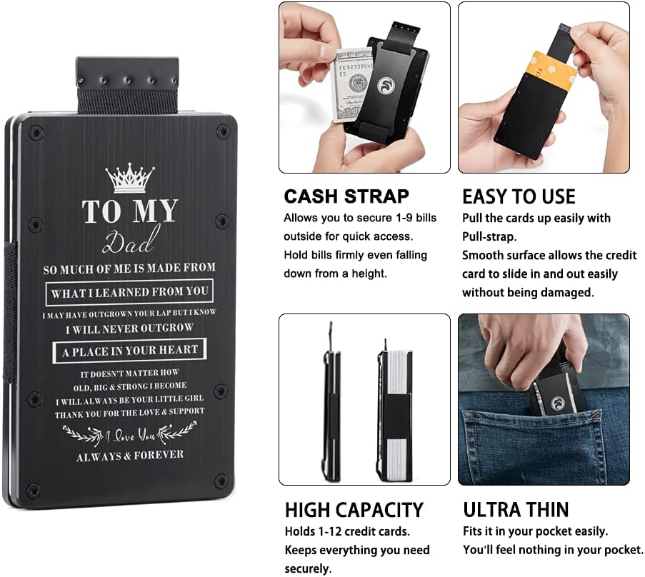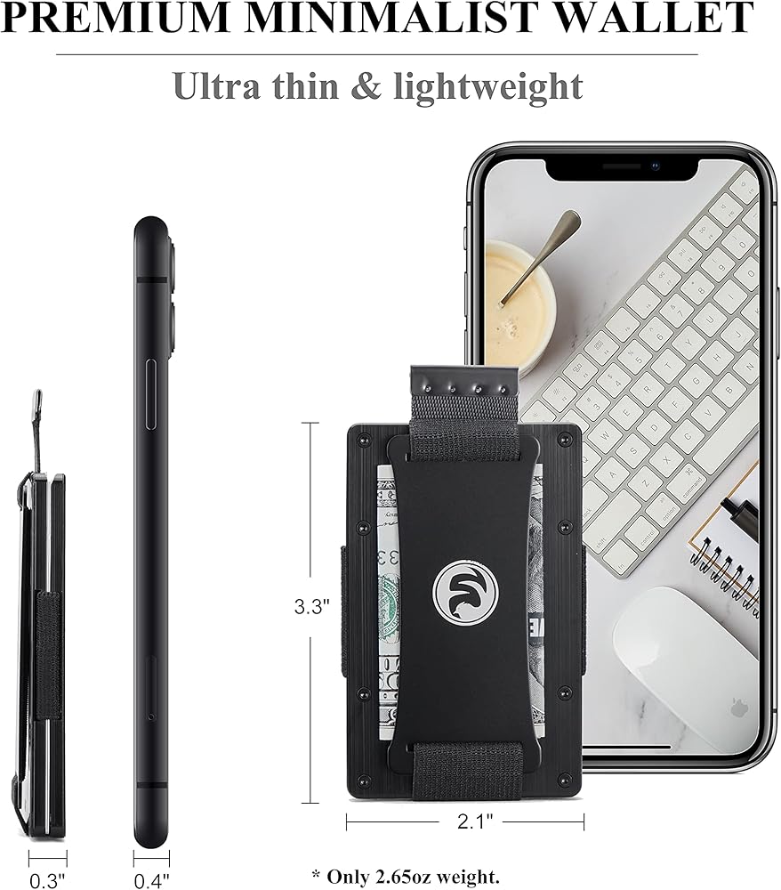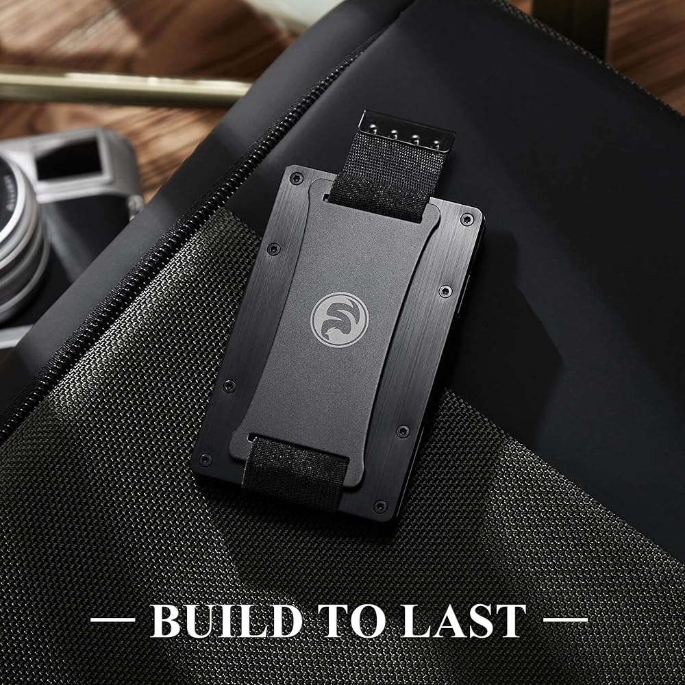 Ultra Thin & Functional >> Slim tactical wallet is made of 6061-T6 military-grade aluminum. 86 x 54 x 6 mm frame , only 2.8 oz. Pull-strap wallets carriy 1-20 cards and 9 Bills. The strap pull the cards up for easier access and the fan-out operation makes the card easy to identify. Cash strap allows you to secure some bills outside for quick access.