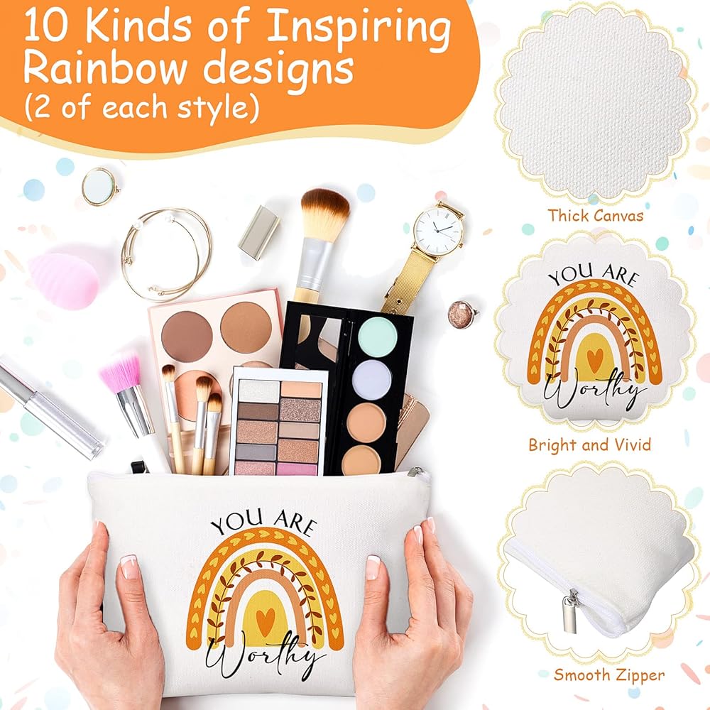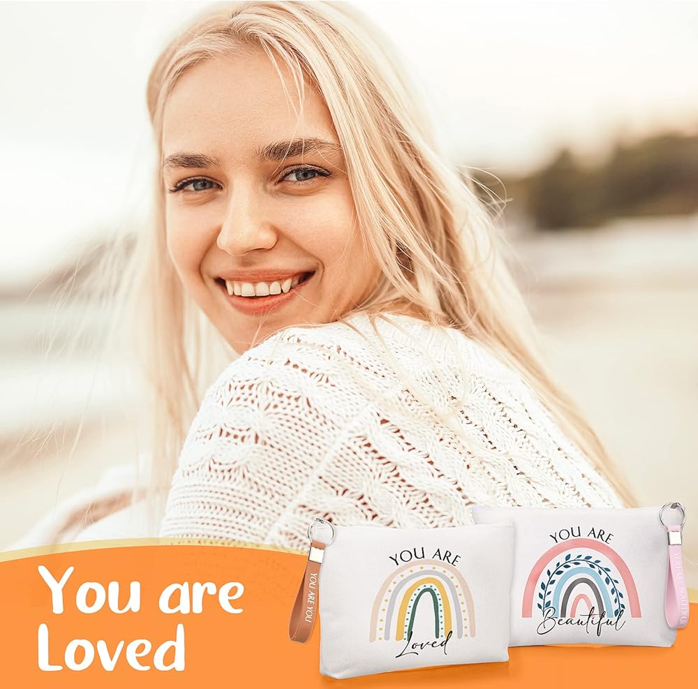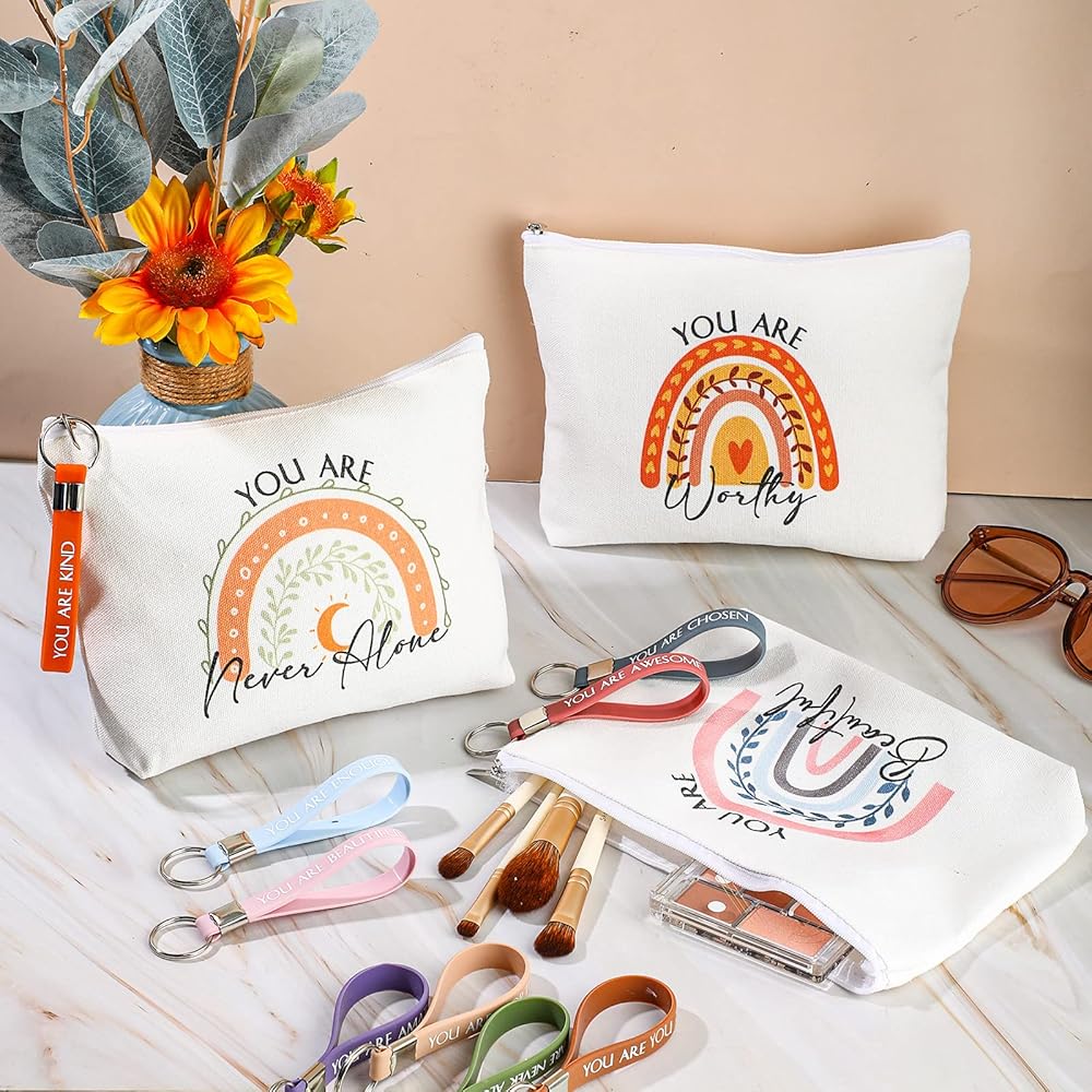 Motivational Quotes and Rainbow Design: the key chain and canvas makeup bags are designed with motivational quotes, such as [YOU ARE NOT ALONE], [YOU ARE WORTHY], [YOU ARE AMAZING], [YOU ARE BRAVE], [YOU ARE BEAUTIFUL], [YOU ARE LOVED] and so on, bringing you the feeling of youth and uplift you when you are in trouble, and the bags are designed with zipper and rainbow, can take you convenience and make you have a happy mood the whole day