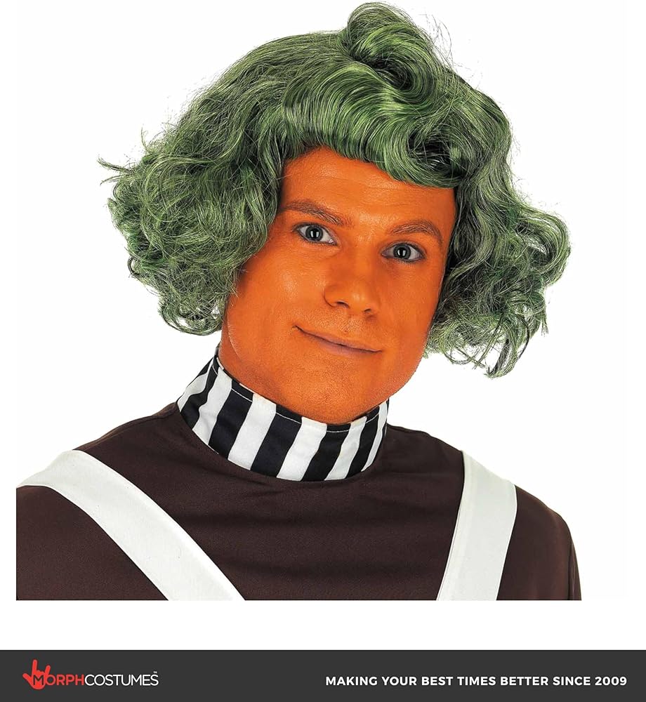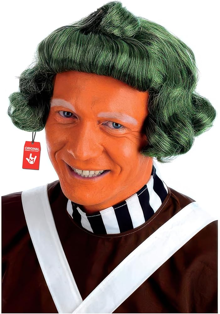 Our high quality mens chocolate factory worker wig: package contains one short, green, curled chocolate factory worker wig.